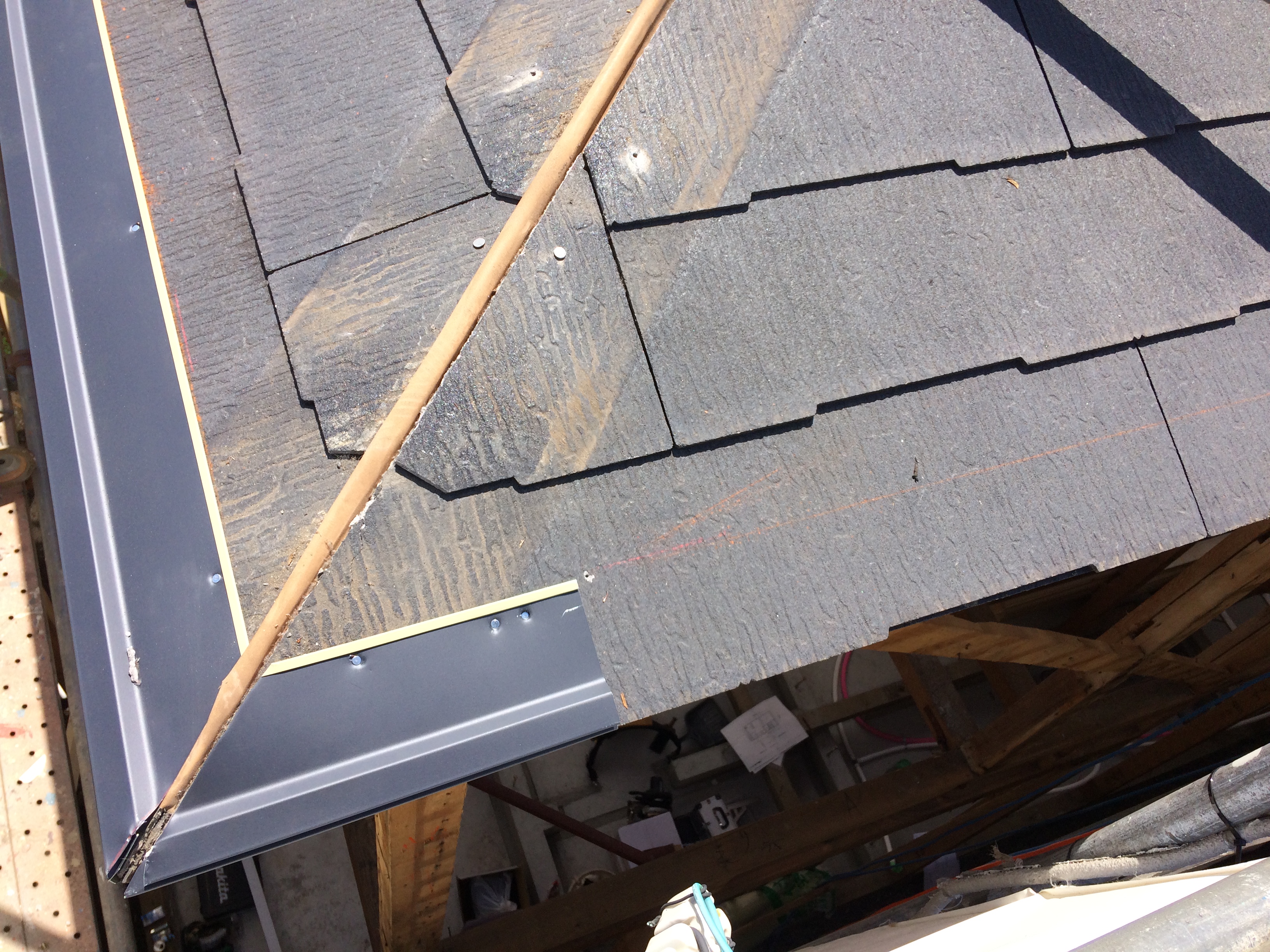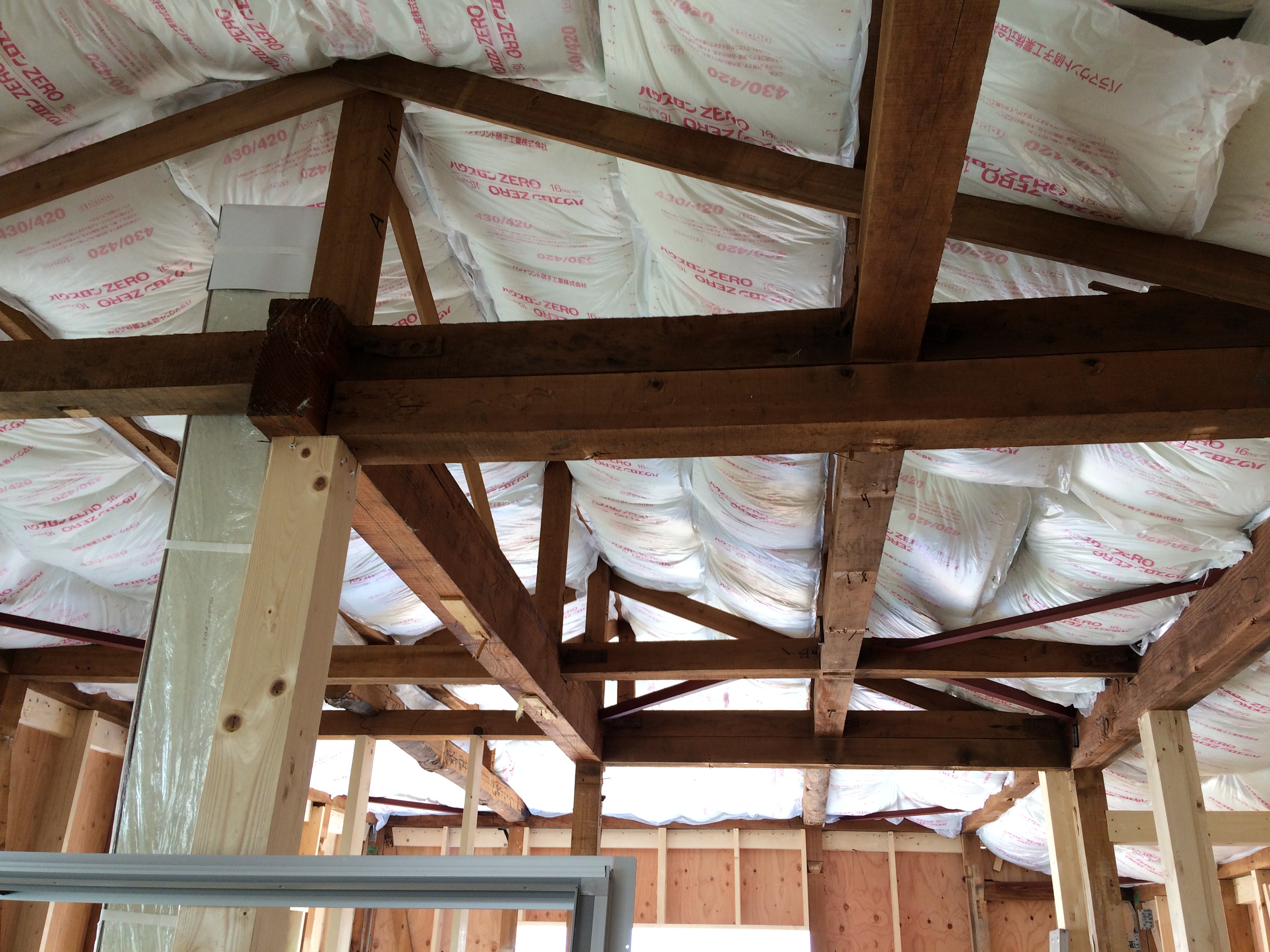 屋根は既存の屋根の上にガルバニュウム鋼板上貼りで断熱材と野地板(屋根の下地)との間に通気層を取ります。