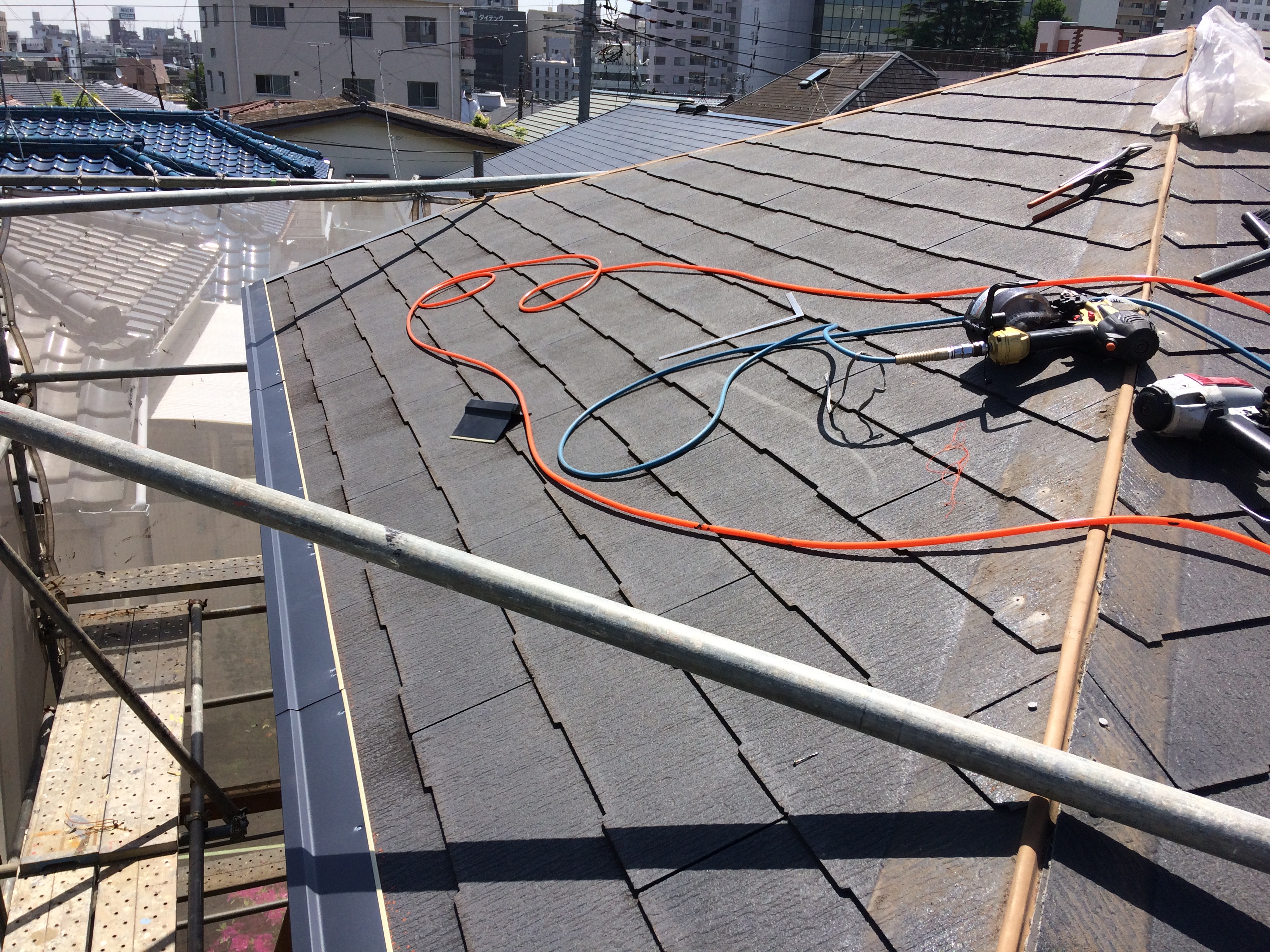 - 屋根材施工:下部より順に張り上げてゆきます。