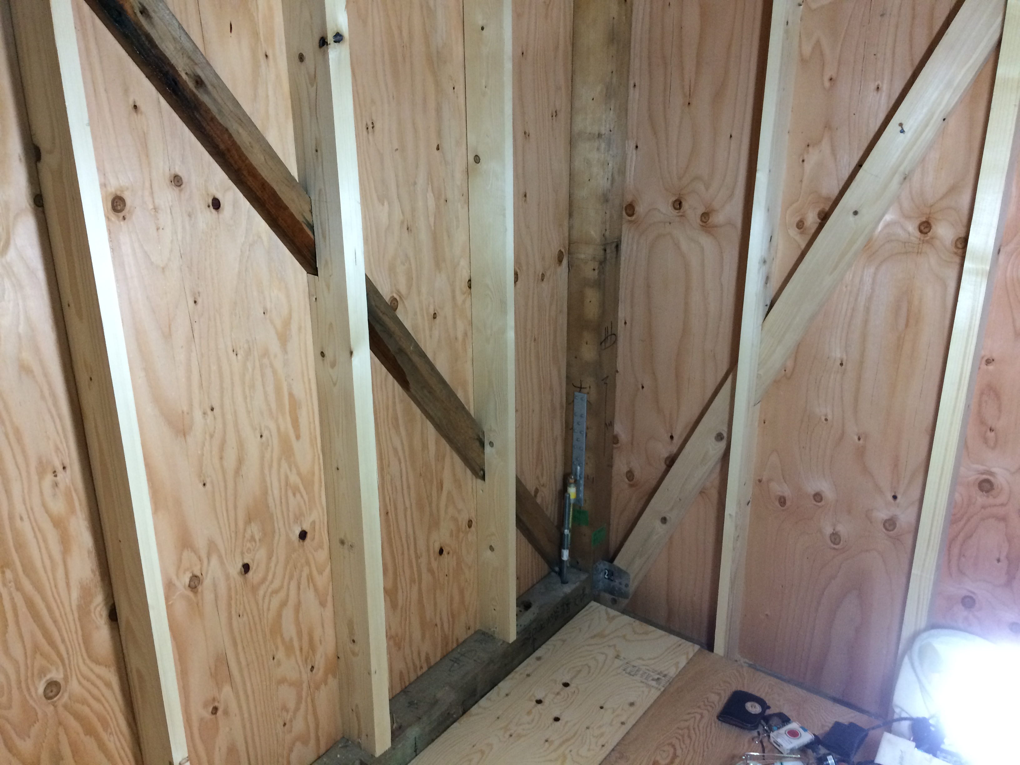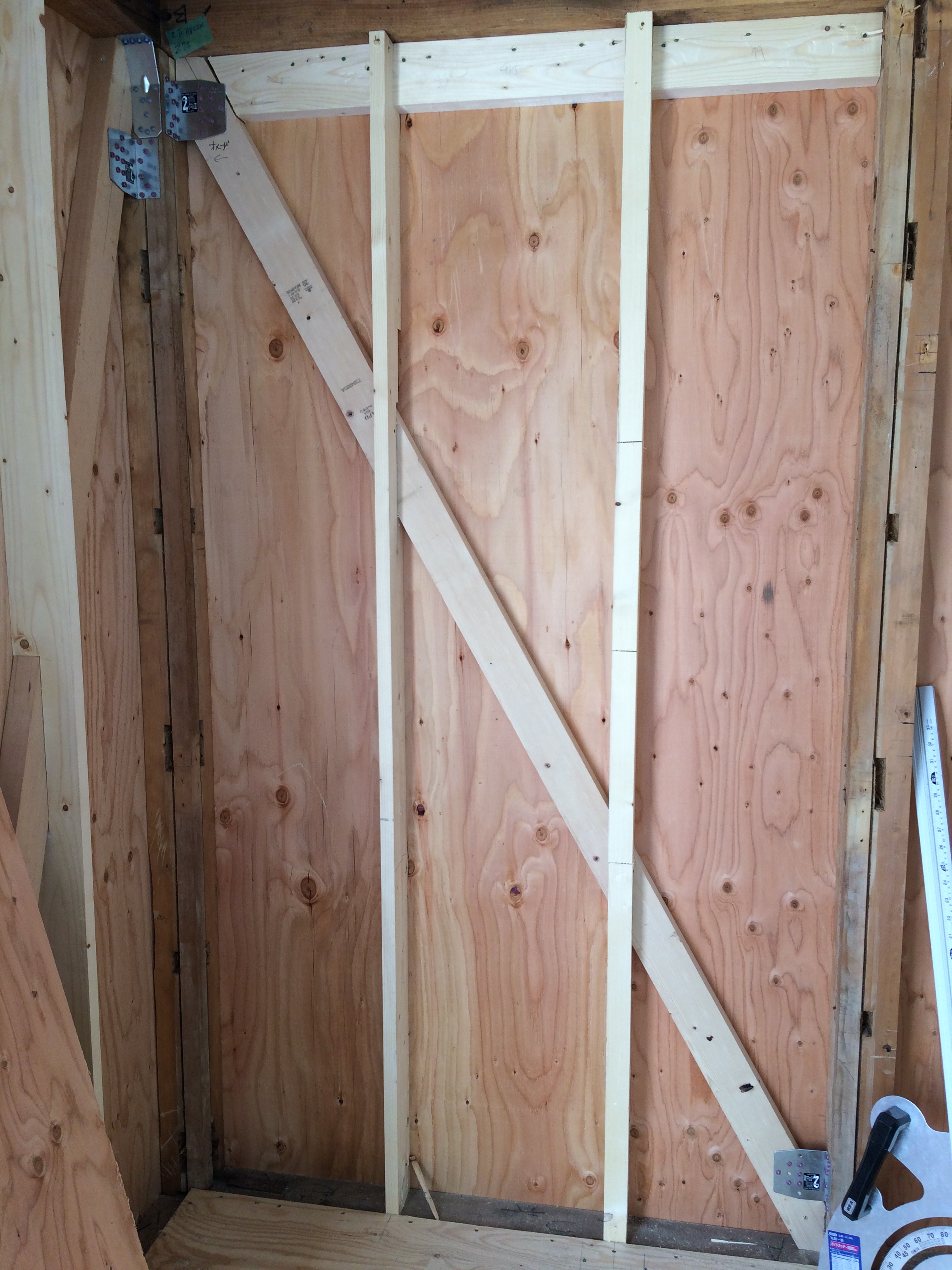 間柱や筋交いを増設及び入れ替え、耐震の為の金物及び壁の構造用合板を取り付けます。