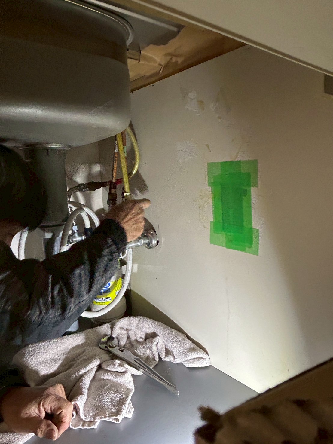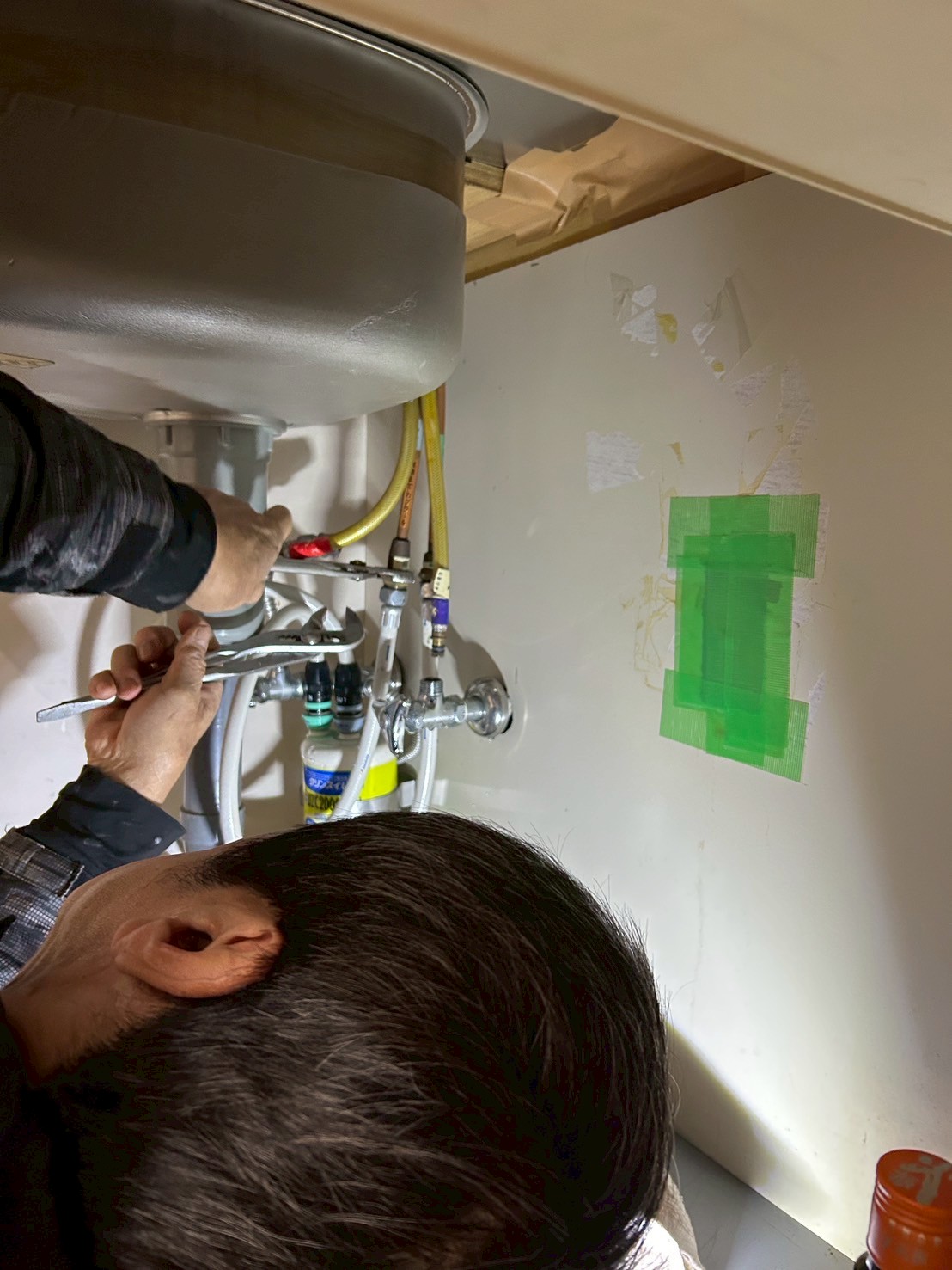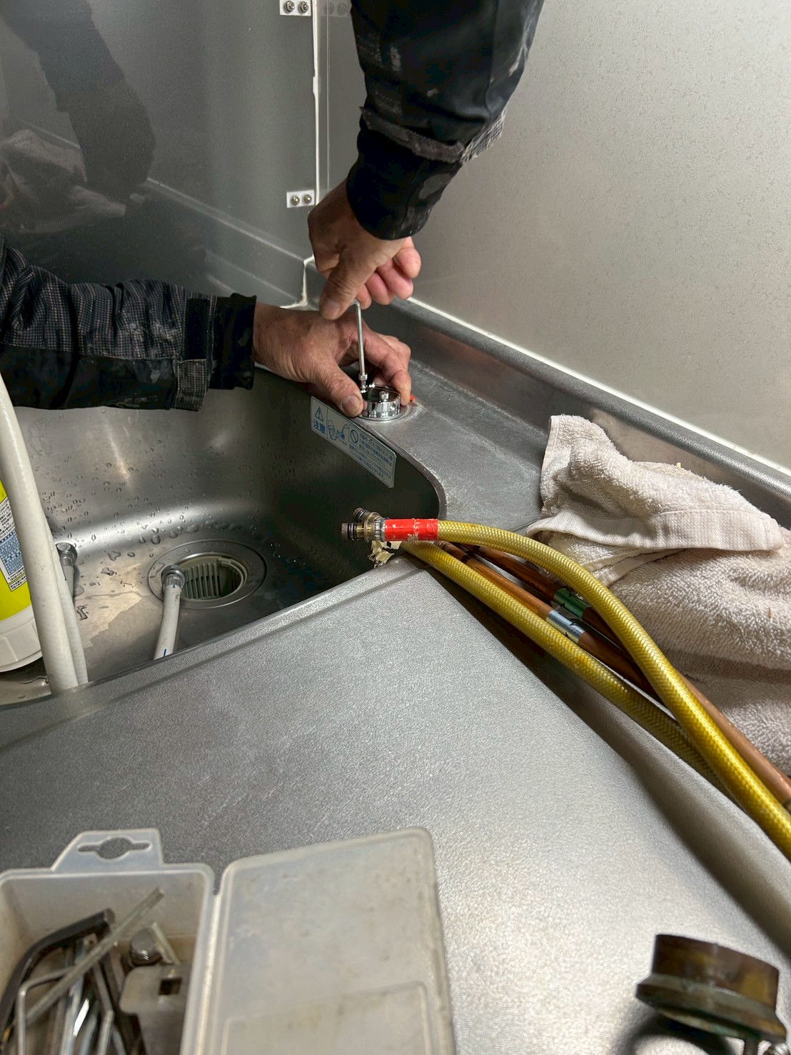 - 04また下にもぐって、給水給湯管を工具で取り外します