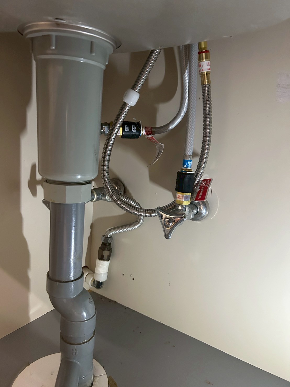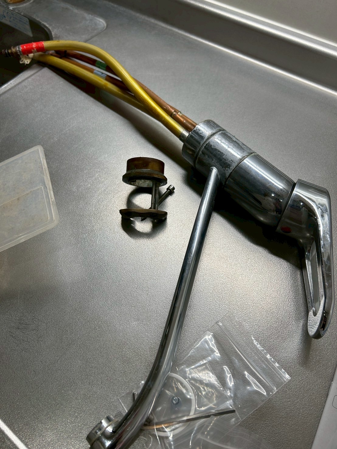 弊社で使用している水栓は18年前に設置したシンク内に浄水器を設置するビルトイン型浄水器となります。カートリッジも定期的に交換し、途中何度か漏水に見舞われたこともございましたが、修理して長年使用しておりました。ところが、先日、浄水器と水栓を接続する配管より漏水し、スパウト部分からも漏水したため、新しい浄水器一体型の水栓へ取り替えました。