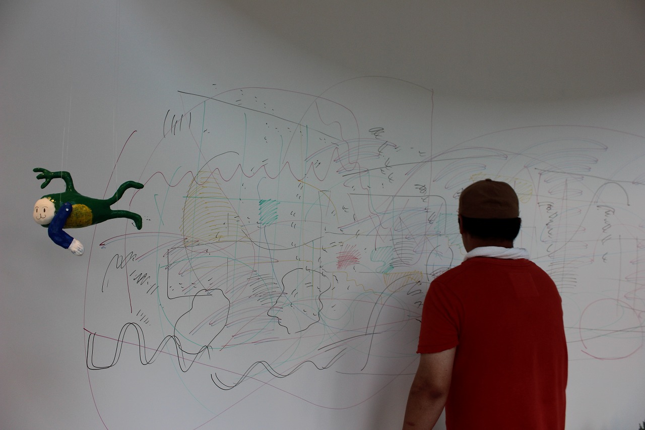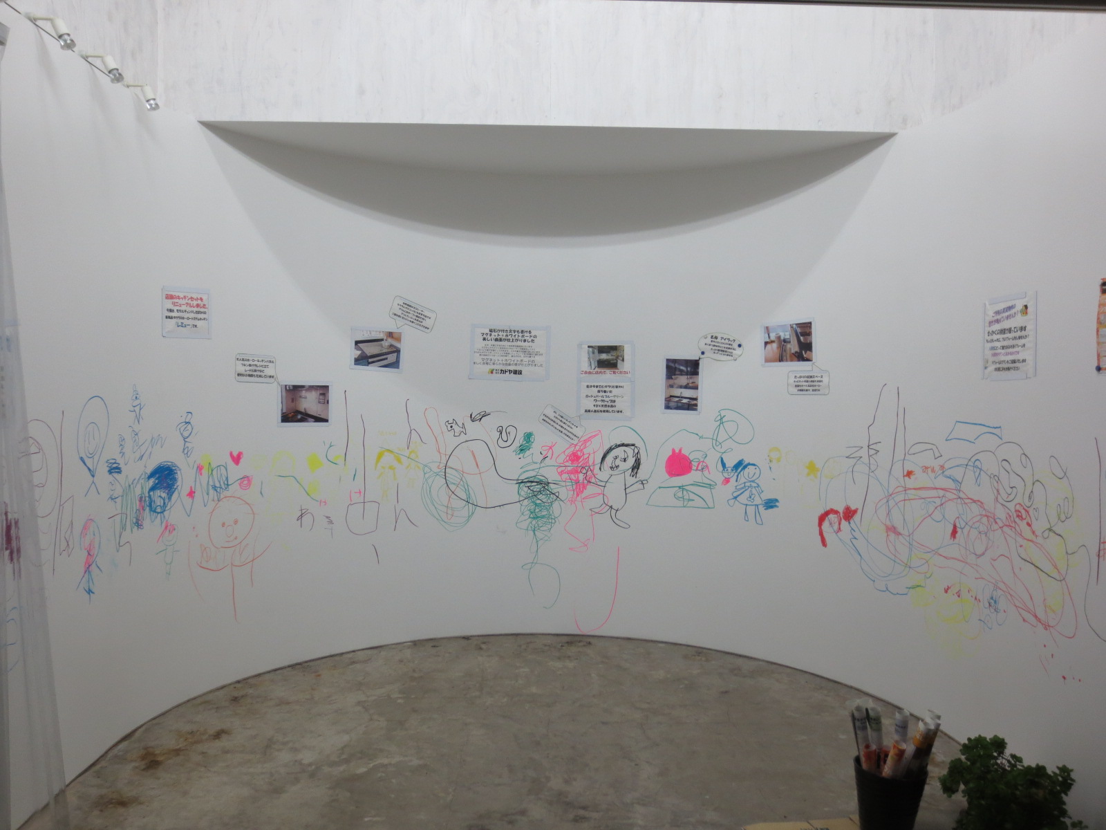 内部のポイントは何と言っても手前側のR壁です。 マグネットペイント+ホワイトボードペイントという特殊な塗料による 仕上げになっており磁石を貼り付けたり、ホワイトボード用のペンで絵や文字を書き込んだりすることができるんです。