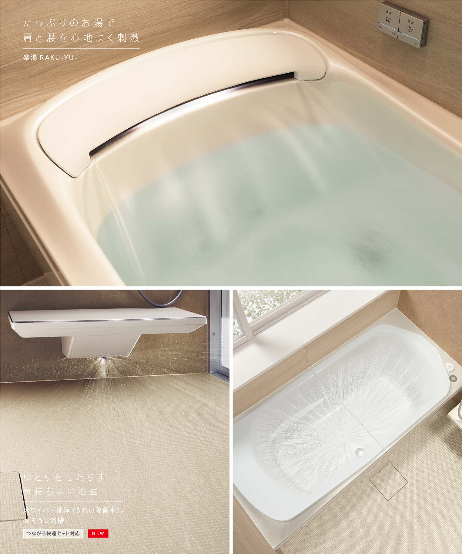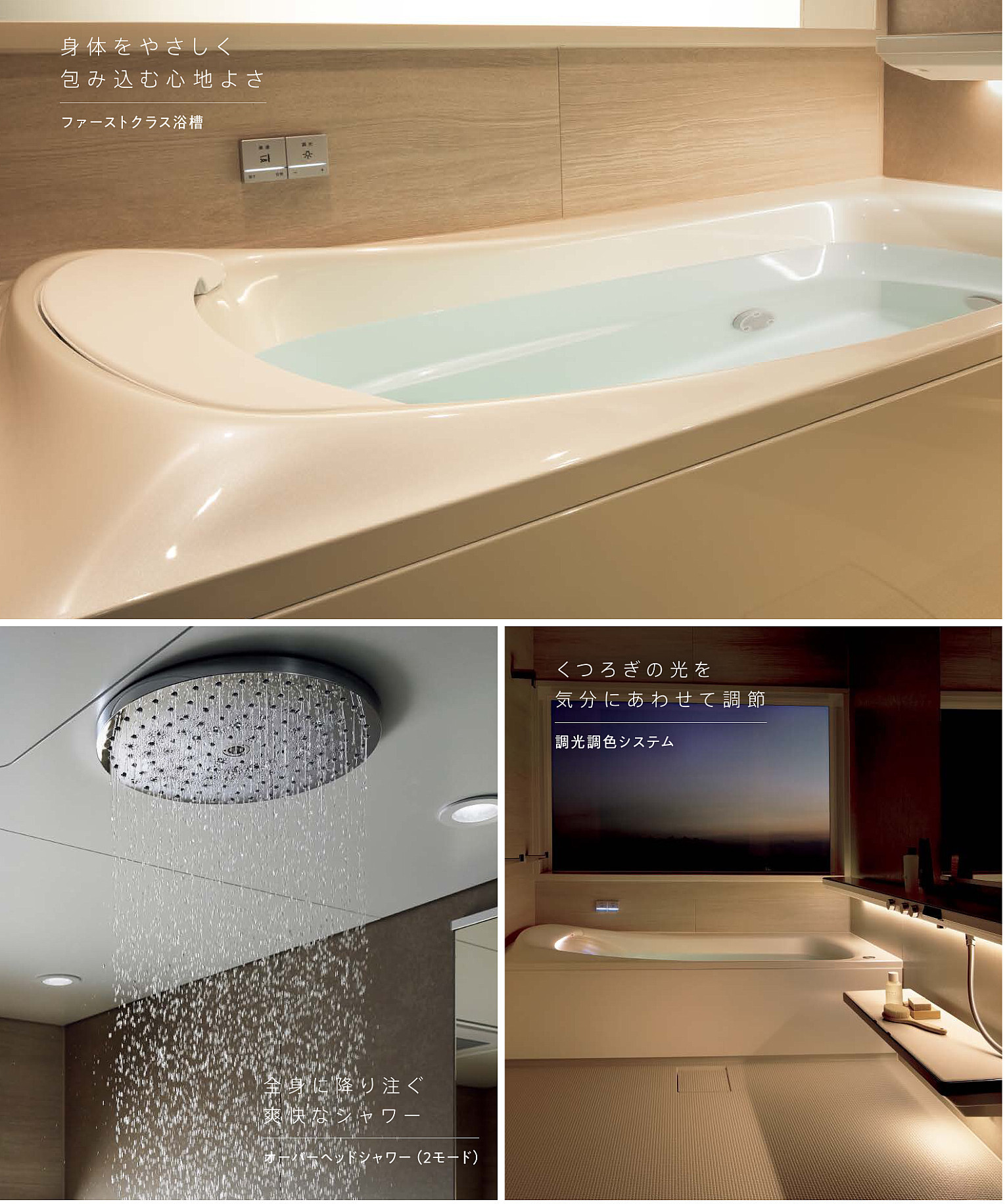 例えば、浴槽の身を預けるような形状、床の冬でも温かく柔らかな感触、マッサージ機能や美容を意識した多機能シャワー、ボタン一つで床や浴槽を清掃・除菌する機能などが存在します。他にも室内暖房・感想機能はもちろんですが、温水を肩に落とす機能とか、最近では照明システムを駆使してリラックス空間を演出するなど各メーカーにより様々な提案がなされています。