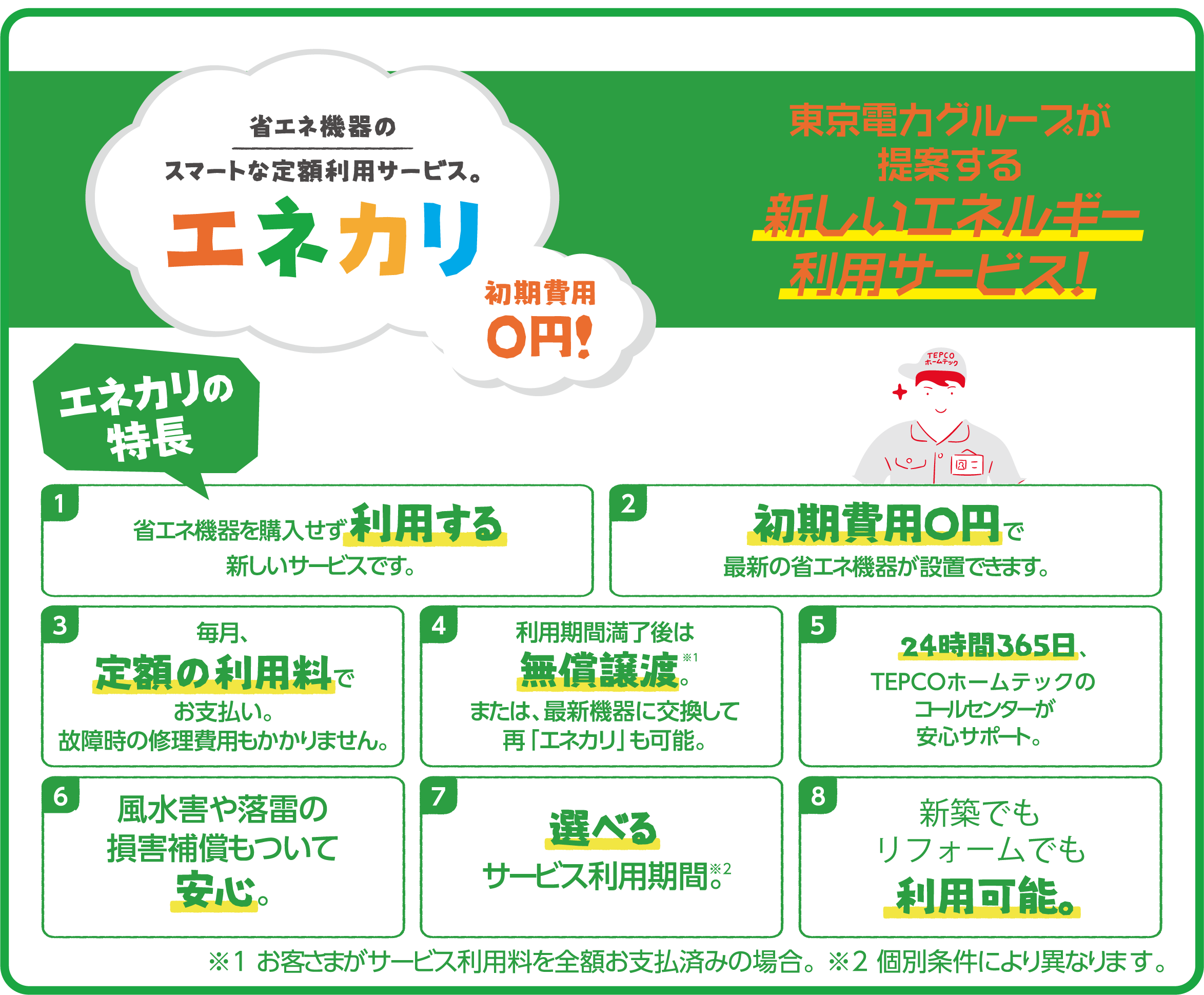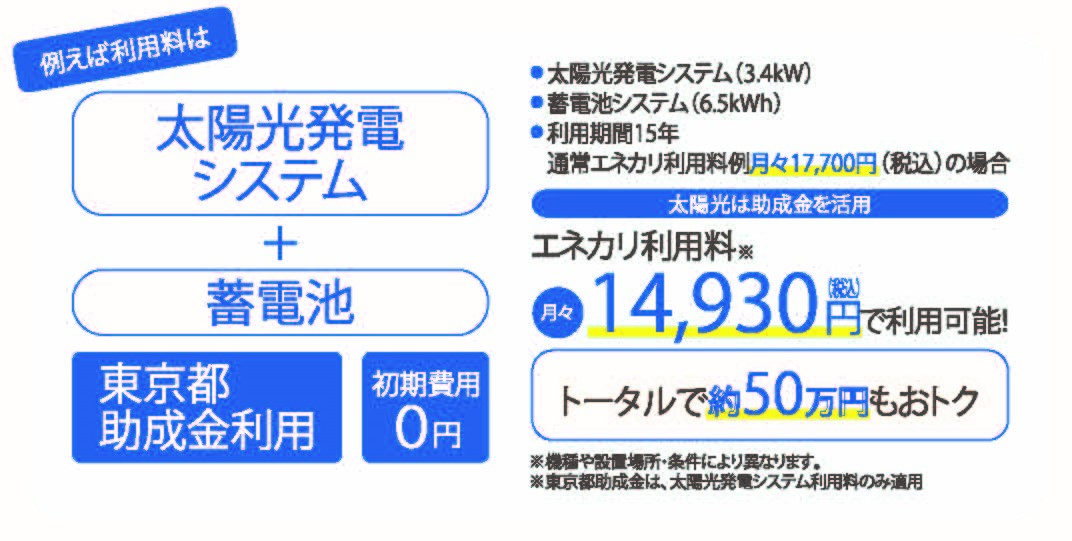 省エネ機器の定額利用サービス『ソーラーエネカリ+蓄電池エネカリ』。