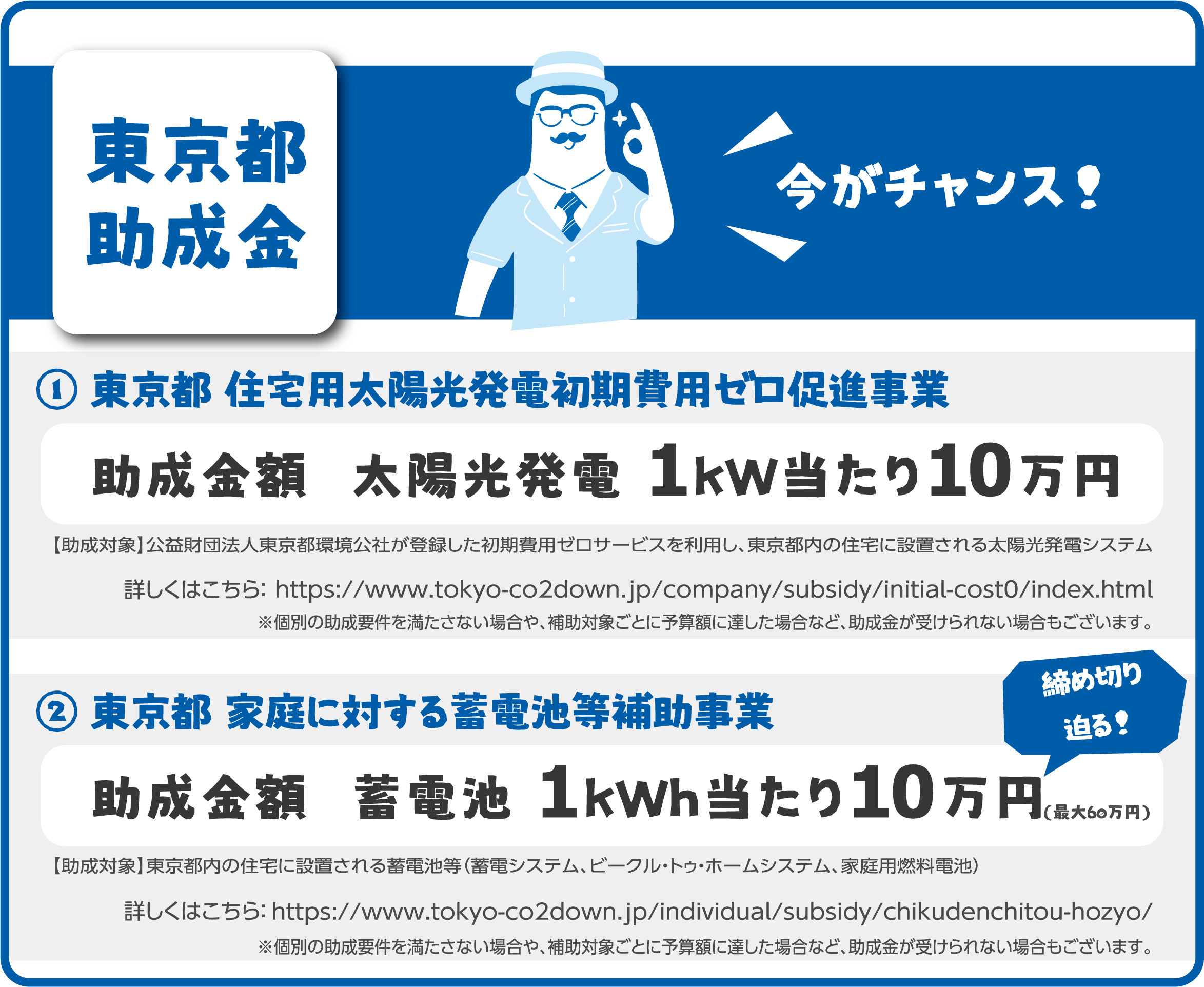 “東京都住宅用太陽光発電初期費用0推進事業”→助成金額;太陽光発電1kw当たり10万円