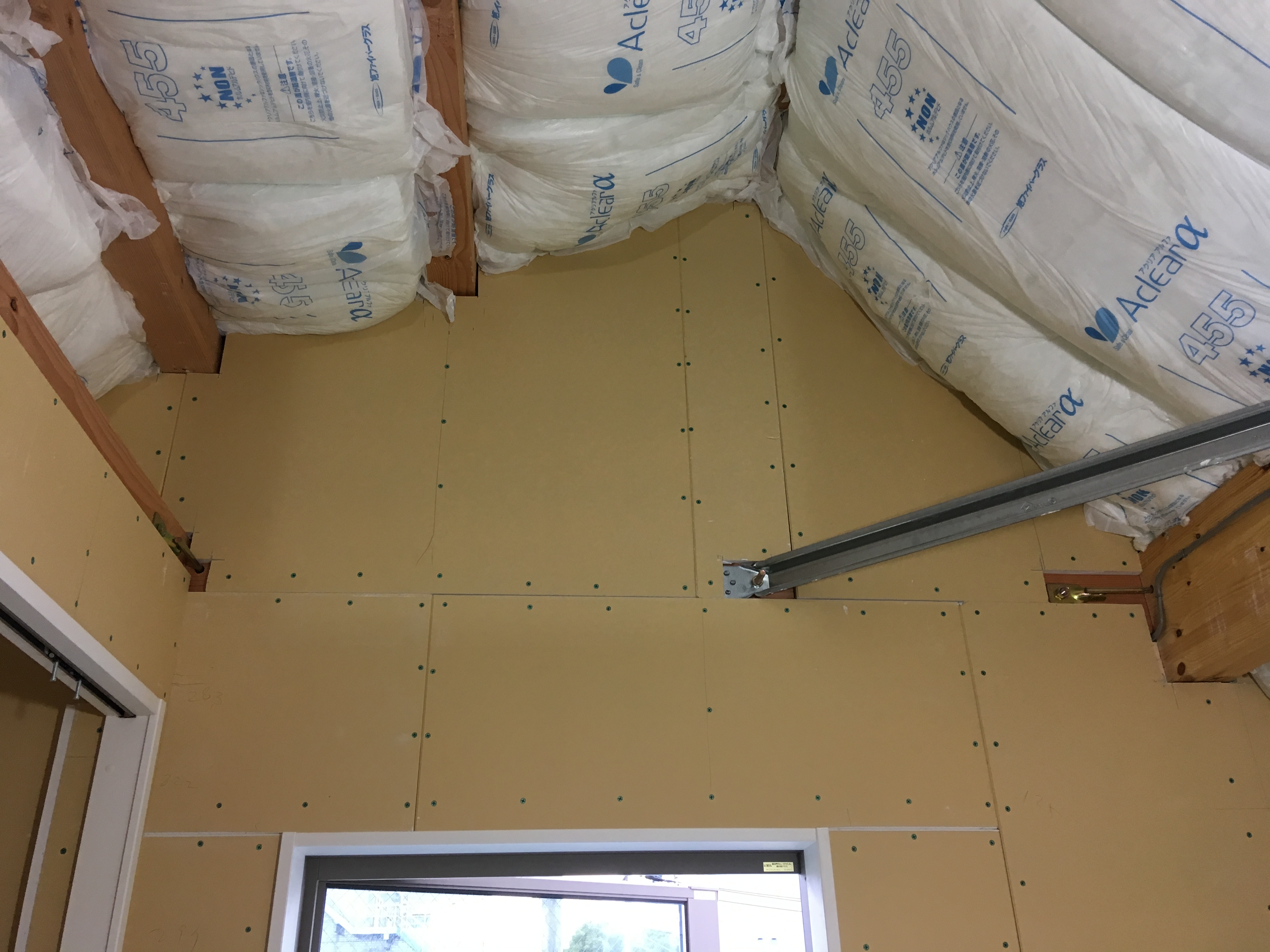 室内に筋交をいれ、断熱材を固定して施工し終わると、石膏ボードを張っていきます。