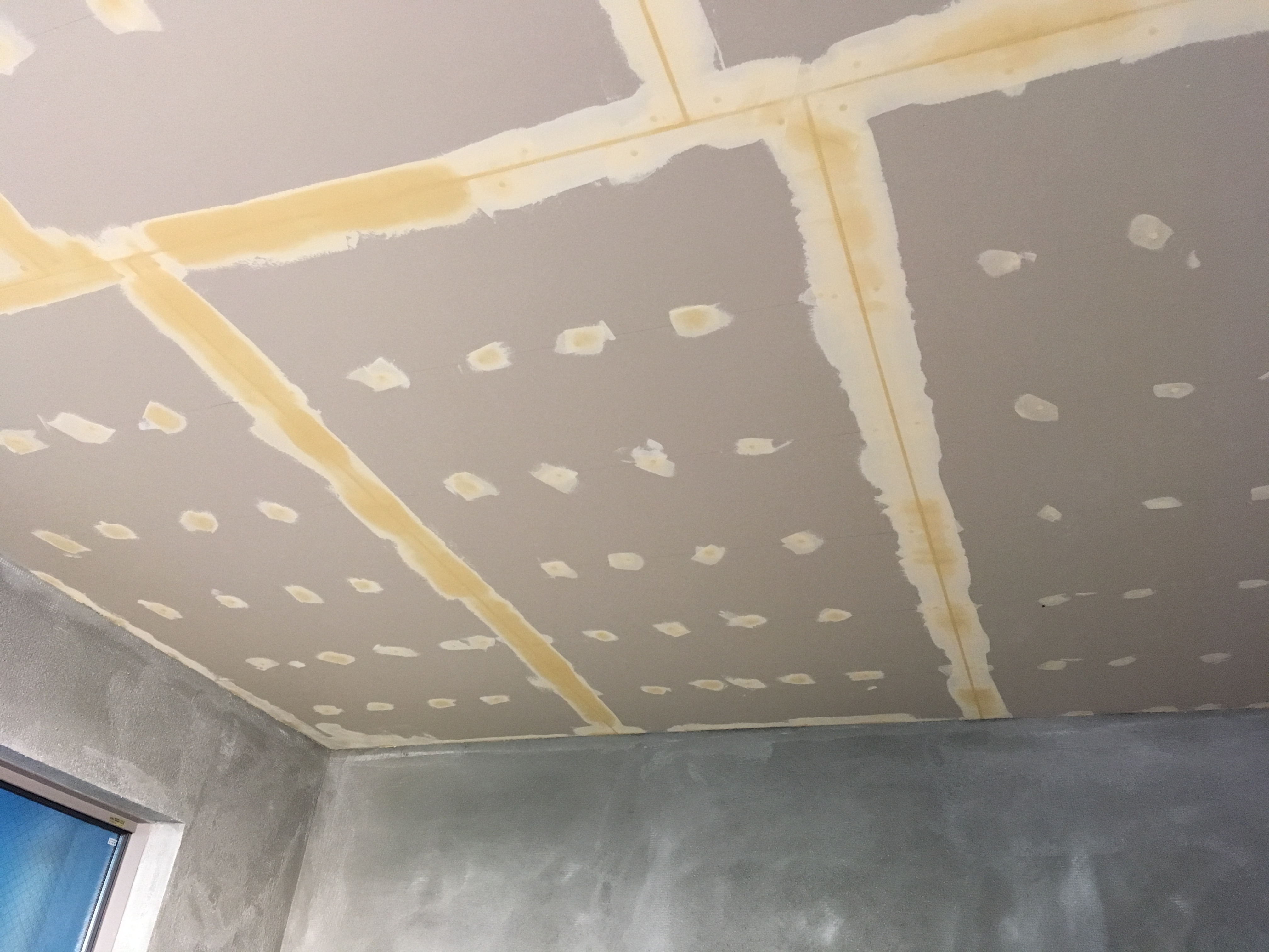 左の車庫天井の画像の黄色いものはパテといい、ボードを固定するのに打ったビスの凹みや、ボード同士の隙間等を埋めて塗料を塗る際に、平らにする為に使われます。基本的に仕上げがクロスでも、塗装でも、パテ処理をきちんとしないと凸凹になってしまいます。新築工事では、比較的少なく済む事が多いですが、造作などで形が複雑になってくると全面パテ処理などもあります。