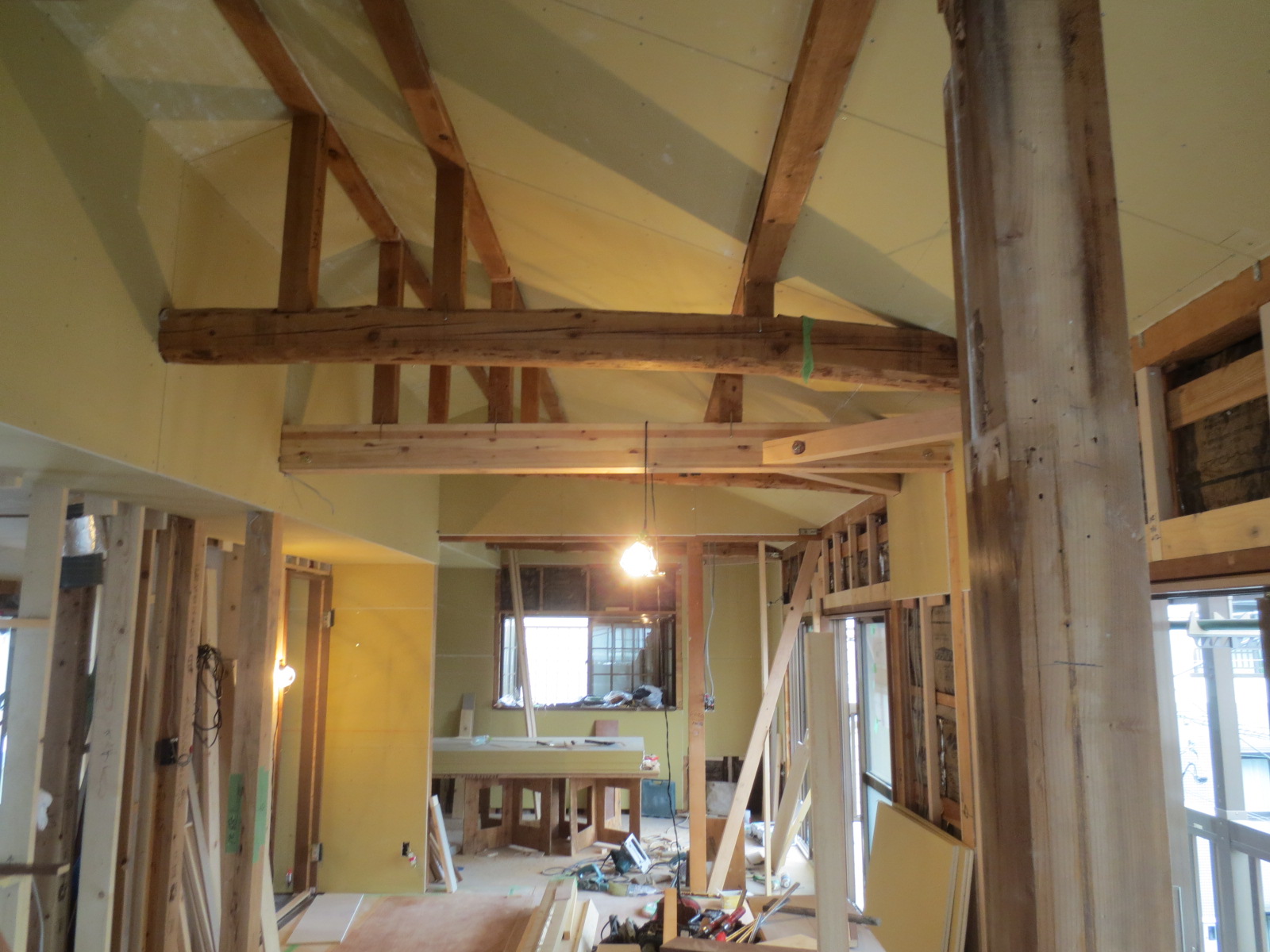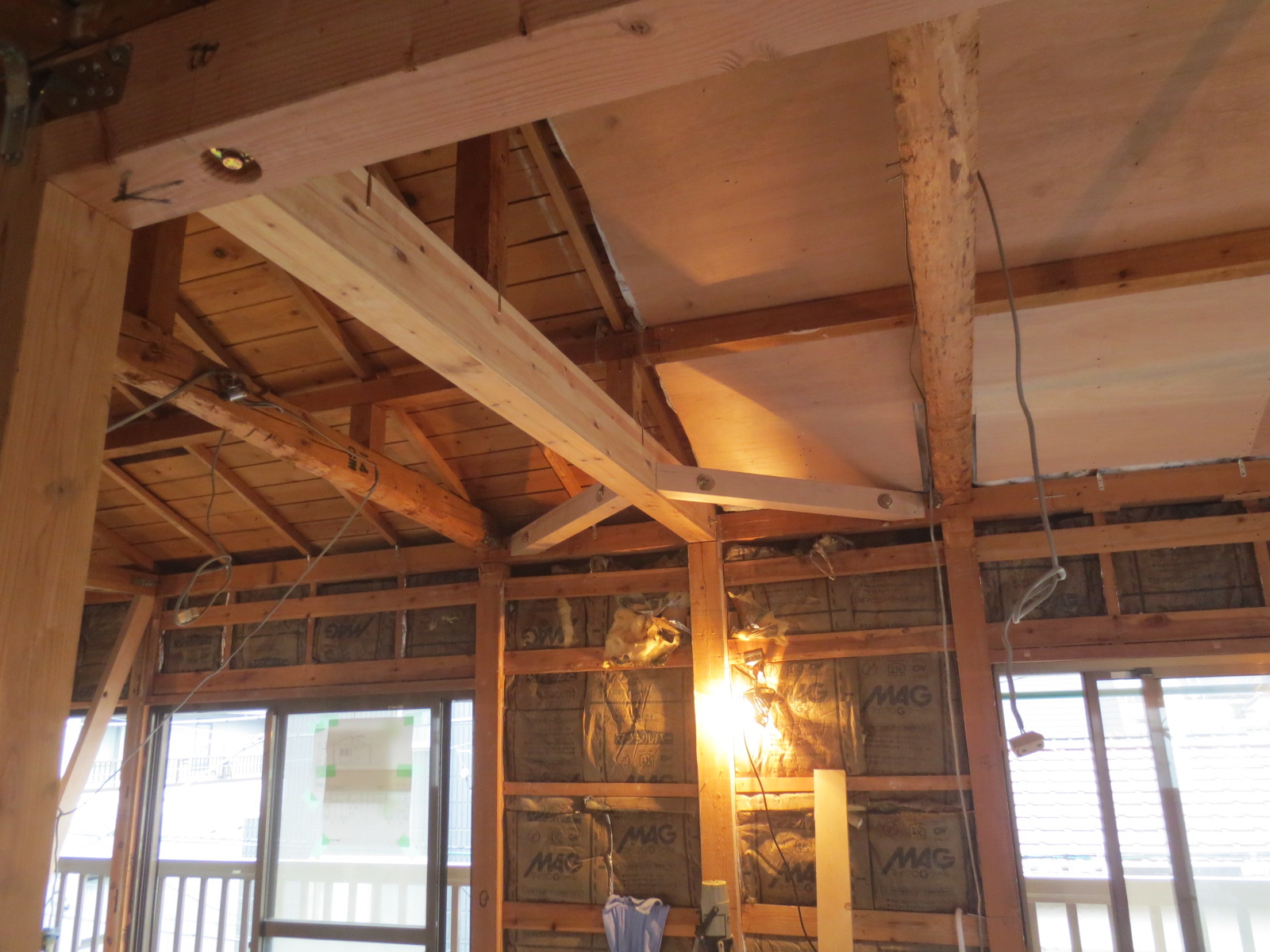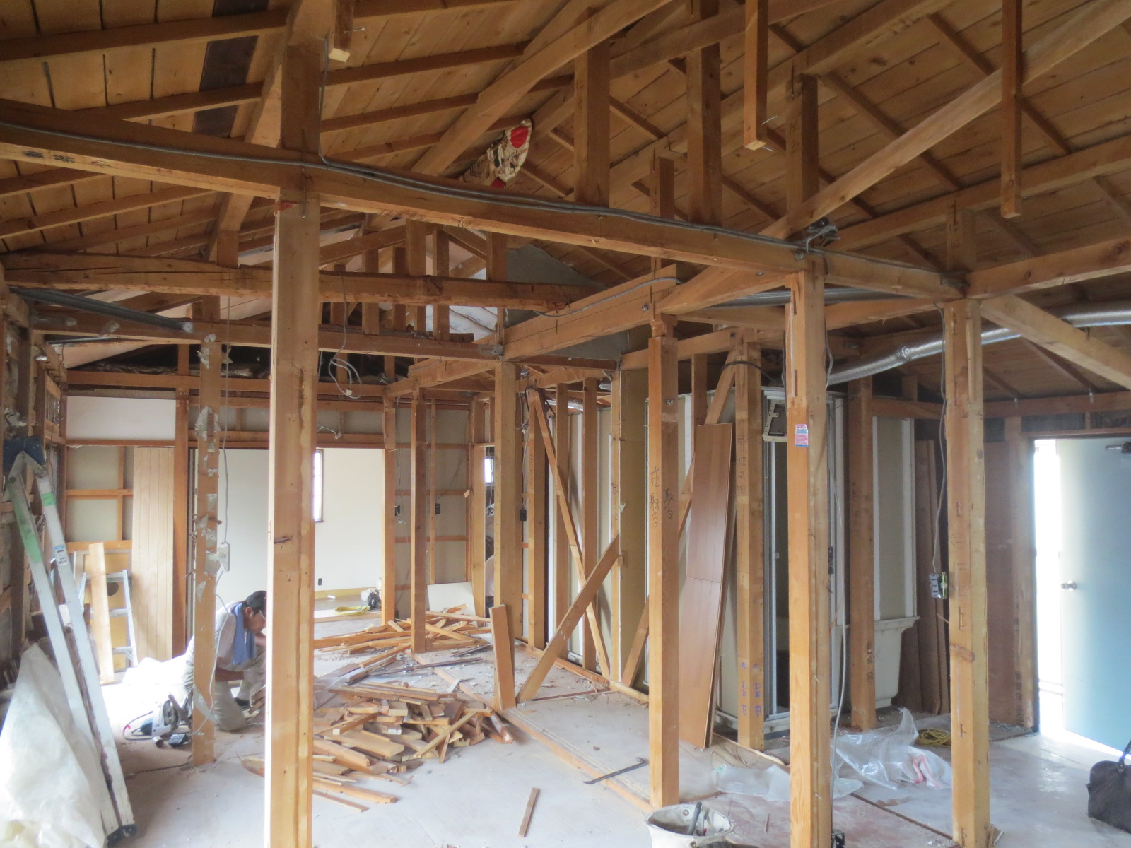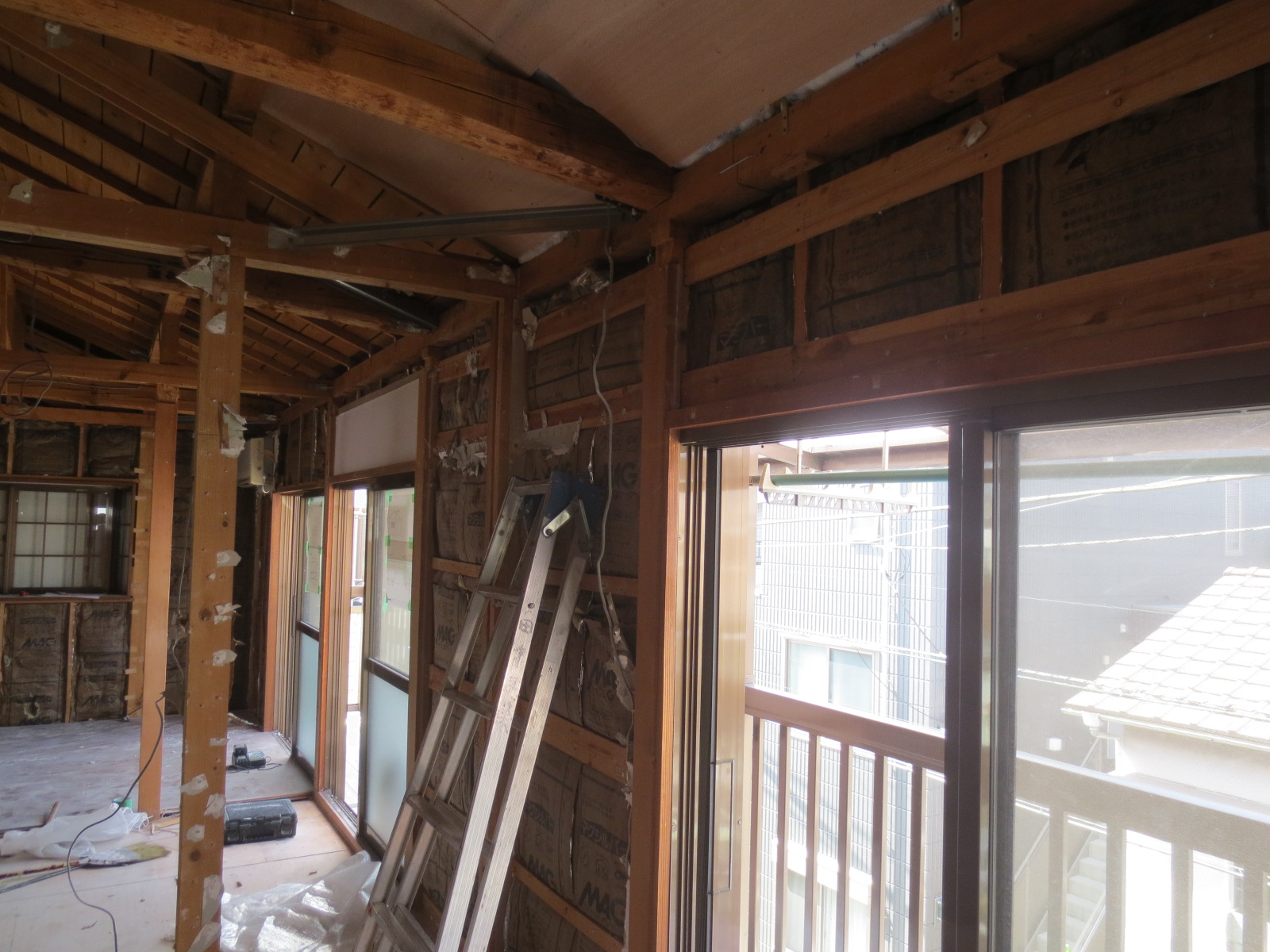 さて、今回はご成約頂いている中から3階建て建物の3階木造部分のフルリフォーム現場をご紹介致します。リフォーム前は2戸の賃貸住宅となっておりましたが、ご家族がお住まいになるという事で、一旦スケルトンにしてからの工事となりました。