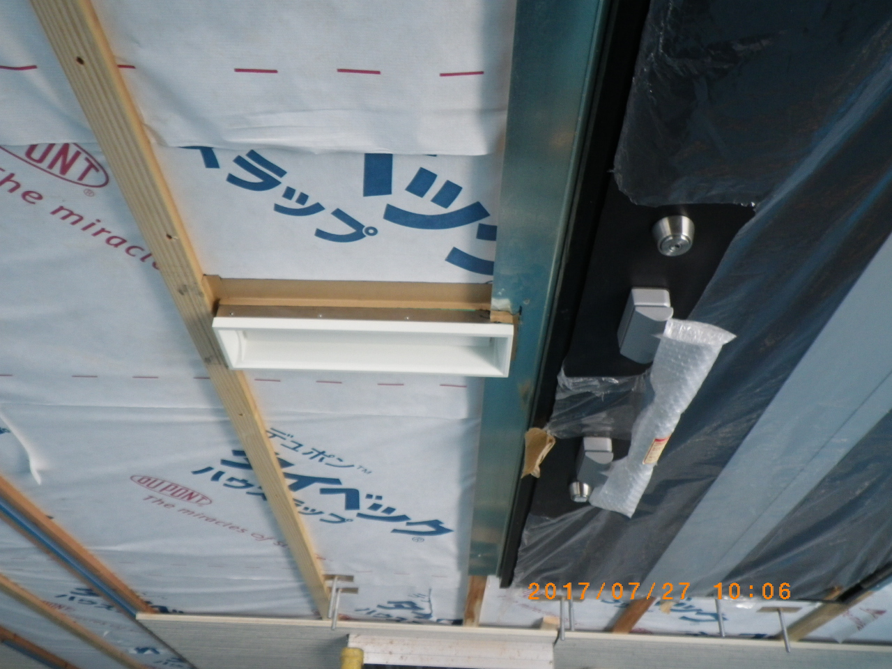 屋根が終了するとバルコニーにFRP防水、次にルーフィング貼りとルーフィングとサイディングの間に15mmの空気層を取る為に、胴縁を打ちます。そして、最後にサイディングを施工いたします。