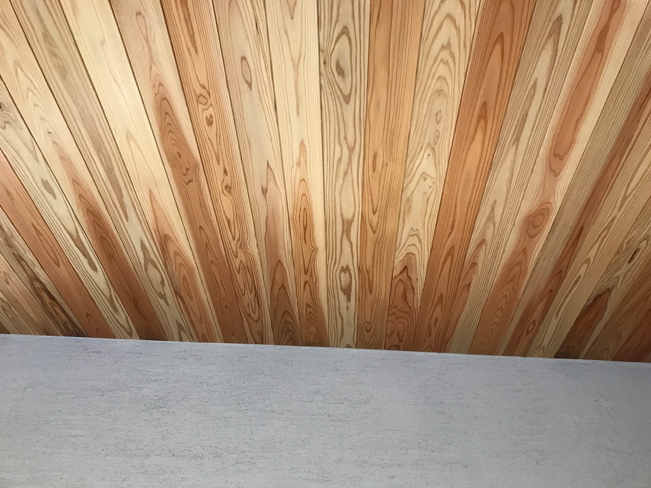 1階のアプローチ兼駐車場の天井は無垢の杉材を貼りました。