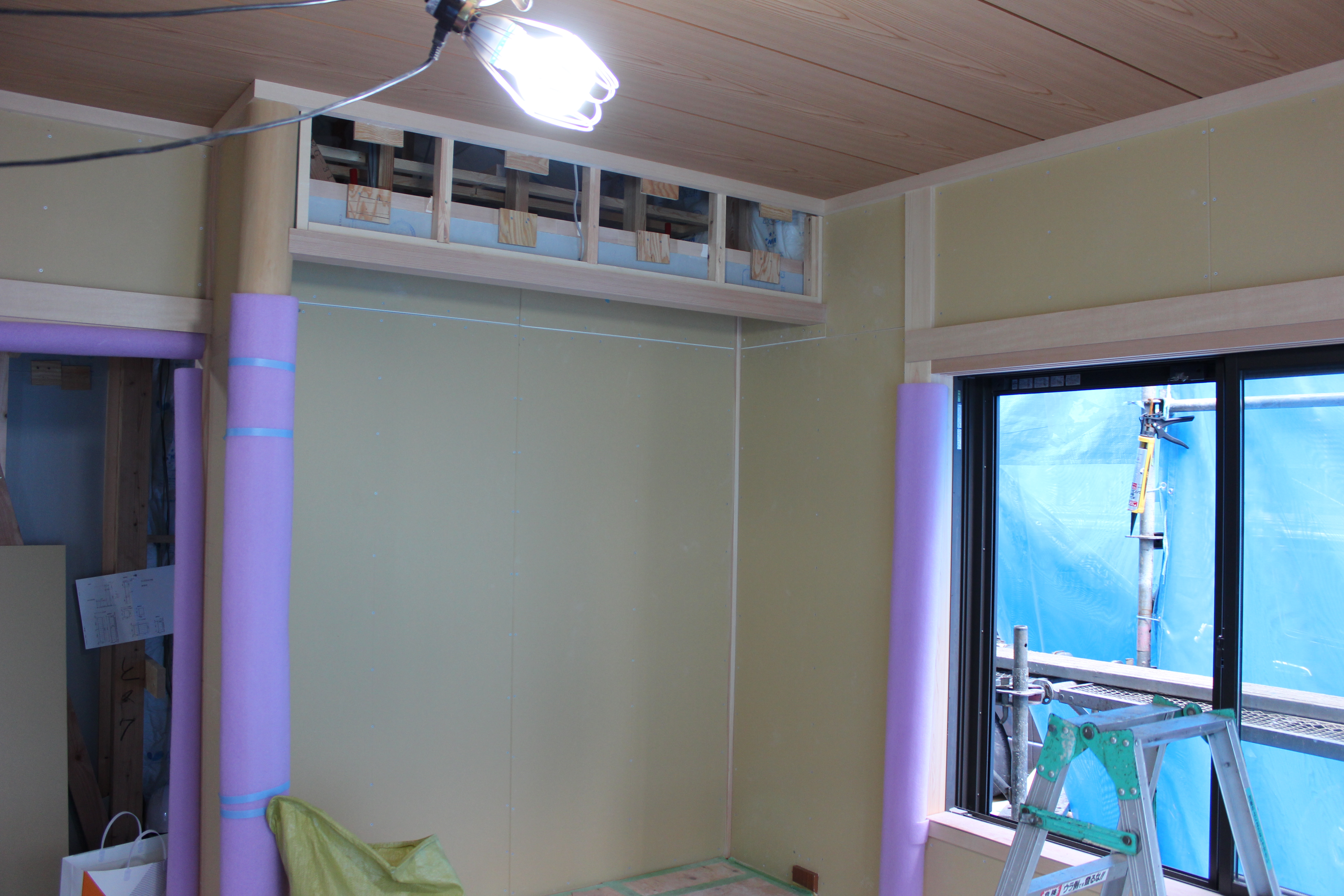 内部造作も進み仕上材の下地を施工しております。(下記画像)