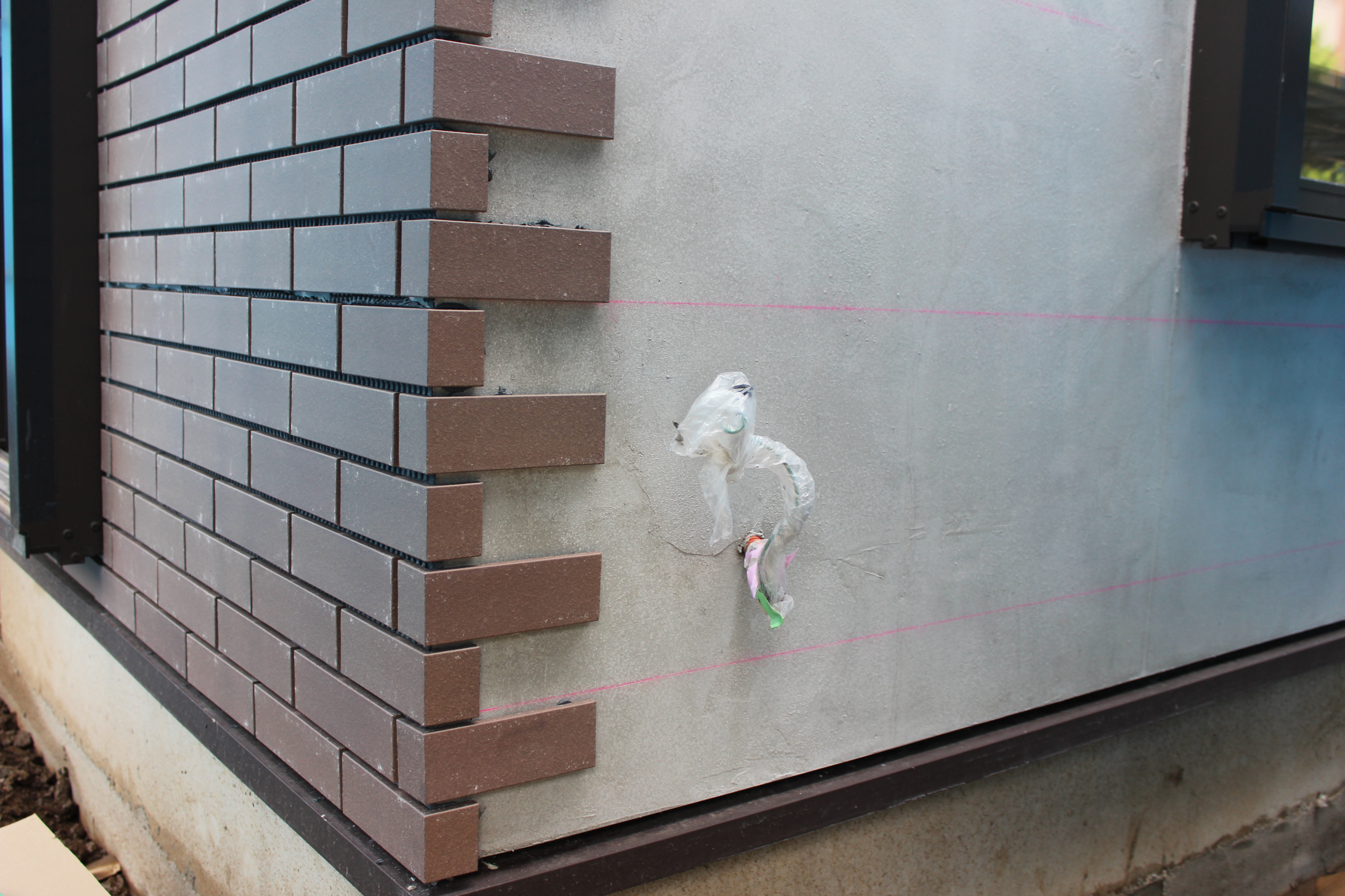 次の画像は外部の工事、タイル貼りです。この建物の外壁は大方サイディング貼りですが、一部タイル貼りのデザインです。先ずはタイルを水平に張るためにモルタル下地に水平の墨を打つところです。(下記画像)