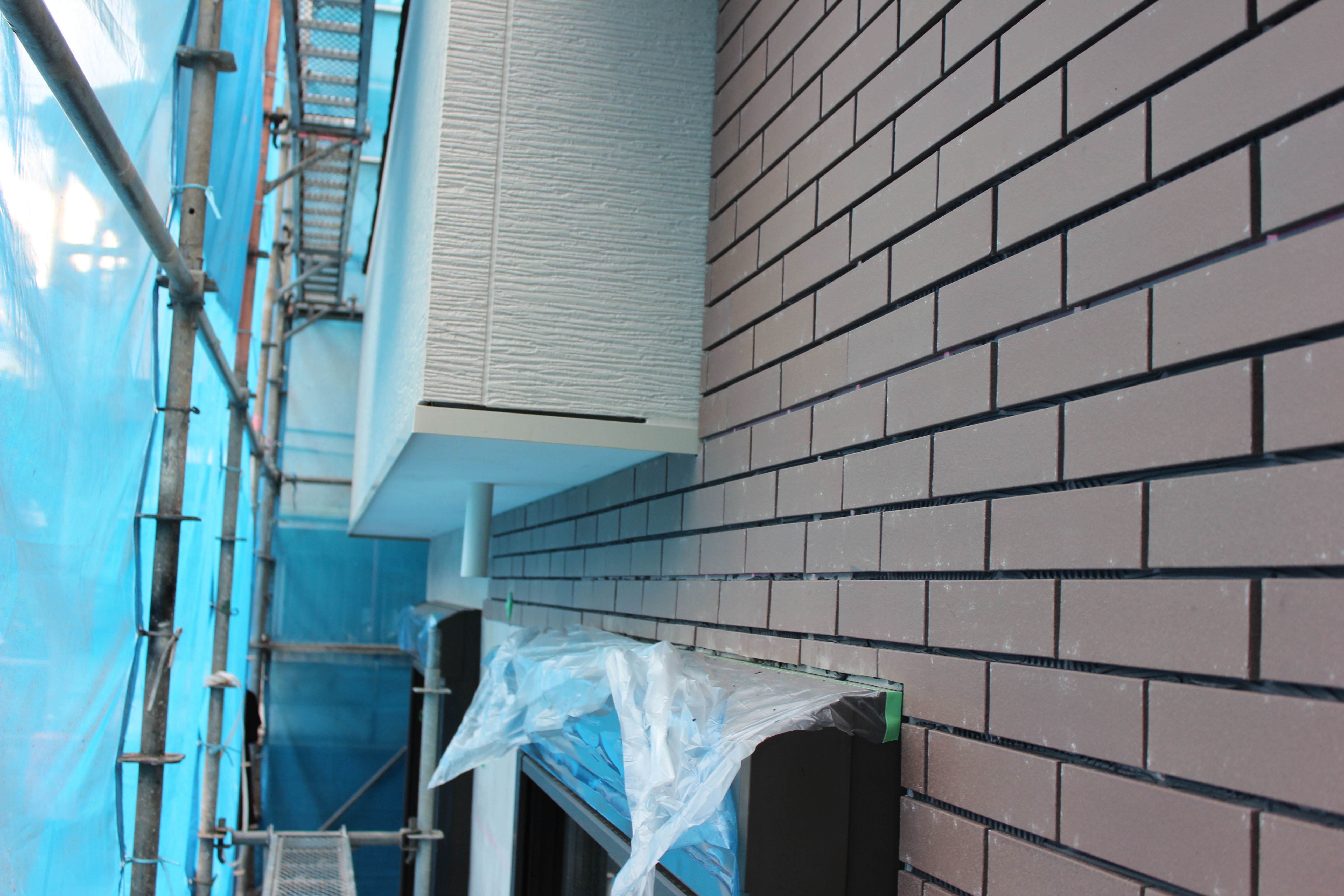 タイル工事を含め樋や東電の通電設置も終わり、外部足場を撤去いたしました。