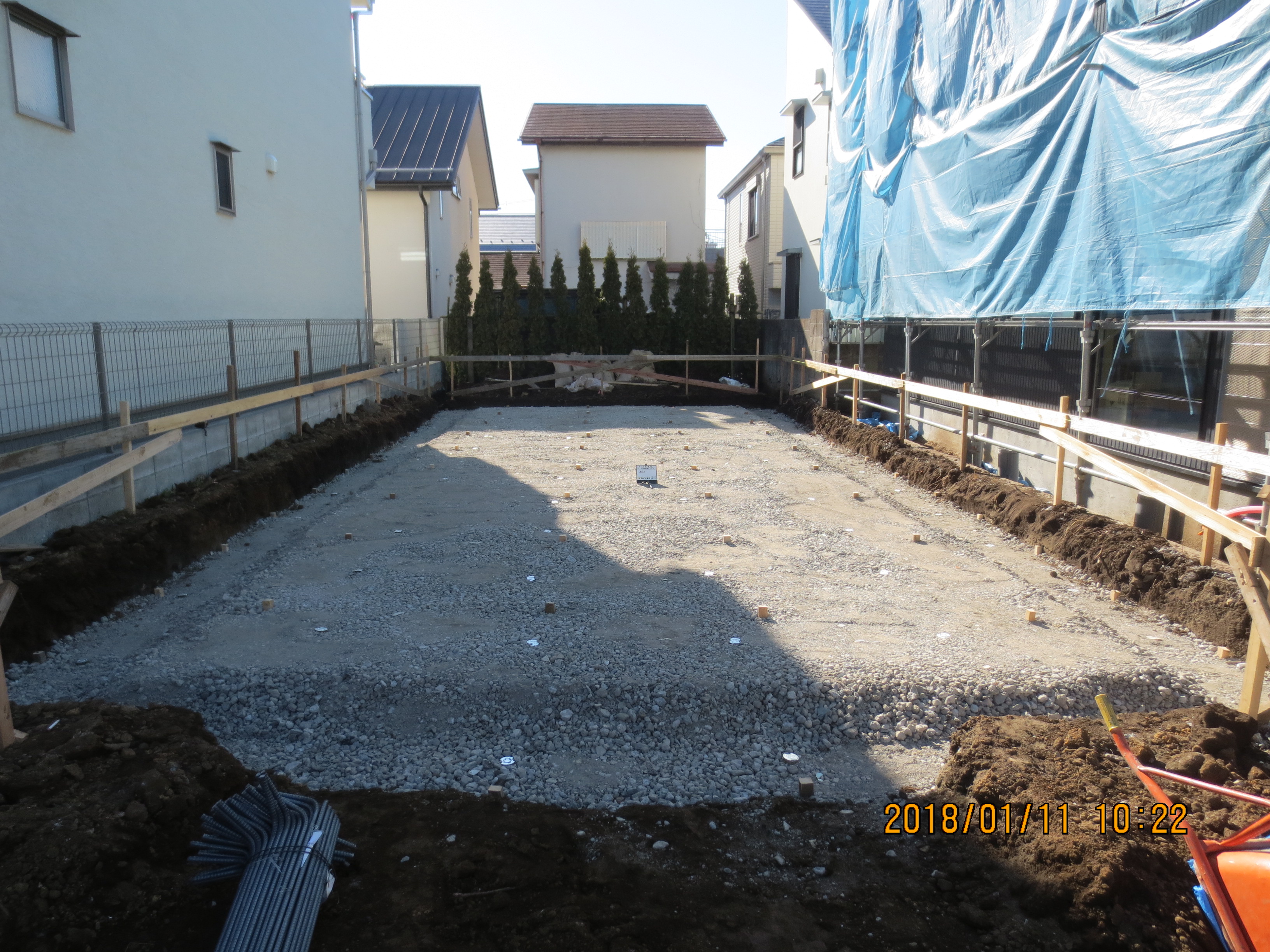 今回『漆喰の家』を新築する土地は世田谷区深沢なのですが、まずは建物の安定性を保つ為に地盤改良をしました。しっかりとした基礎にするには、地盤もしっかりとさせる必要があります。料理で言うところの下ごしらえになりますので、住みやすさに左右する、とても重要な工事になります。