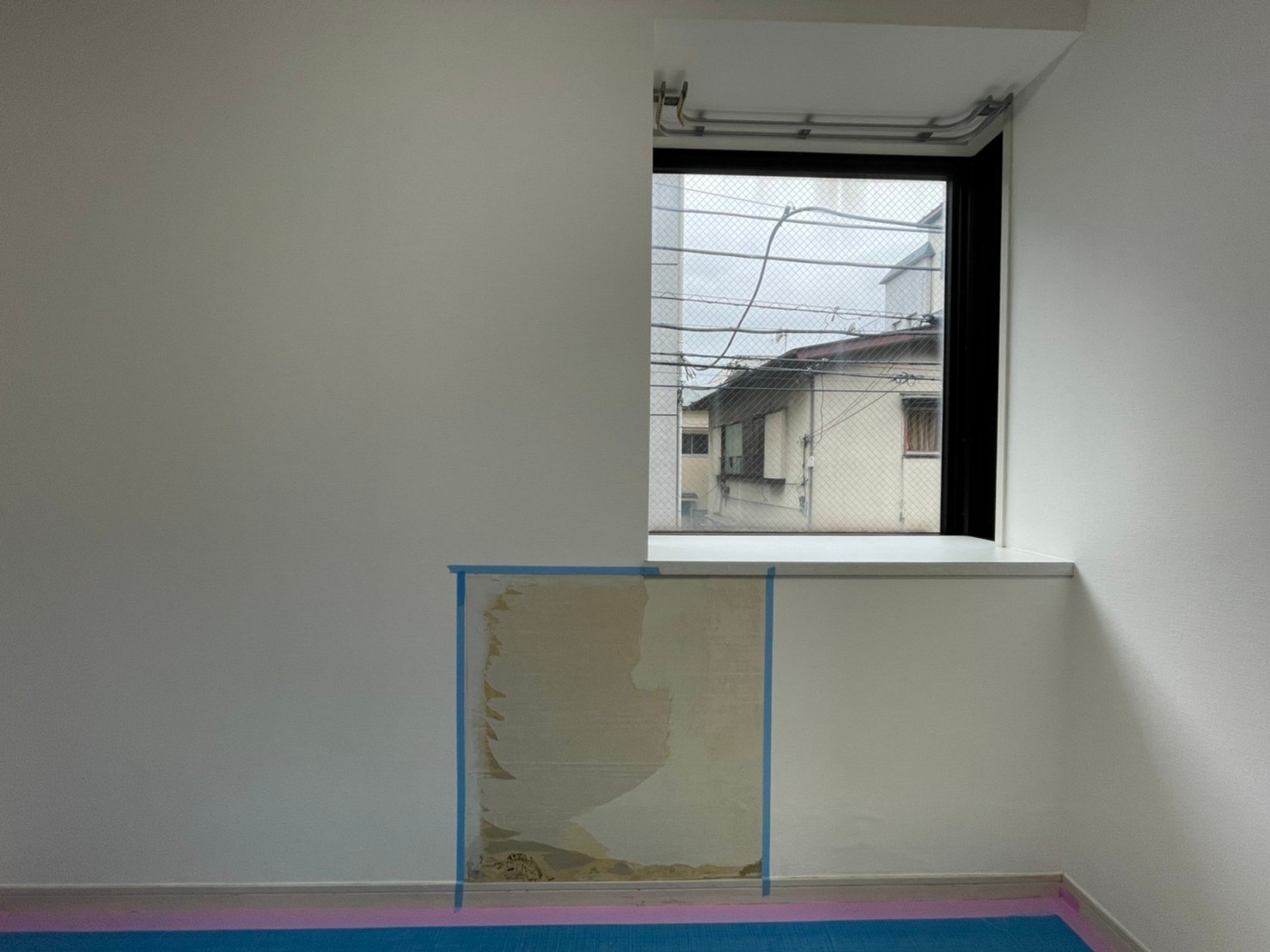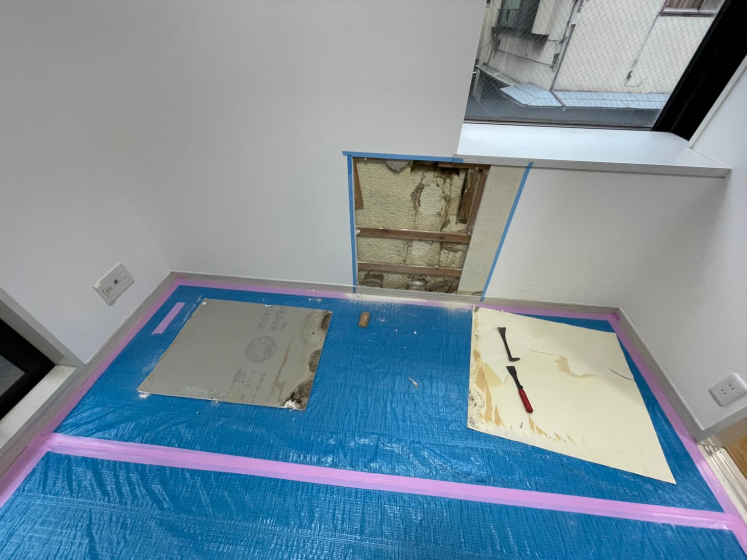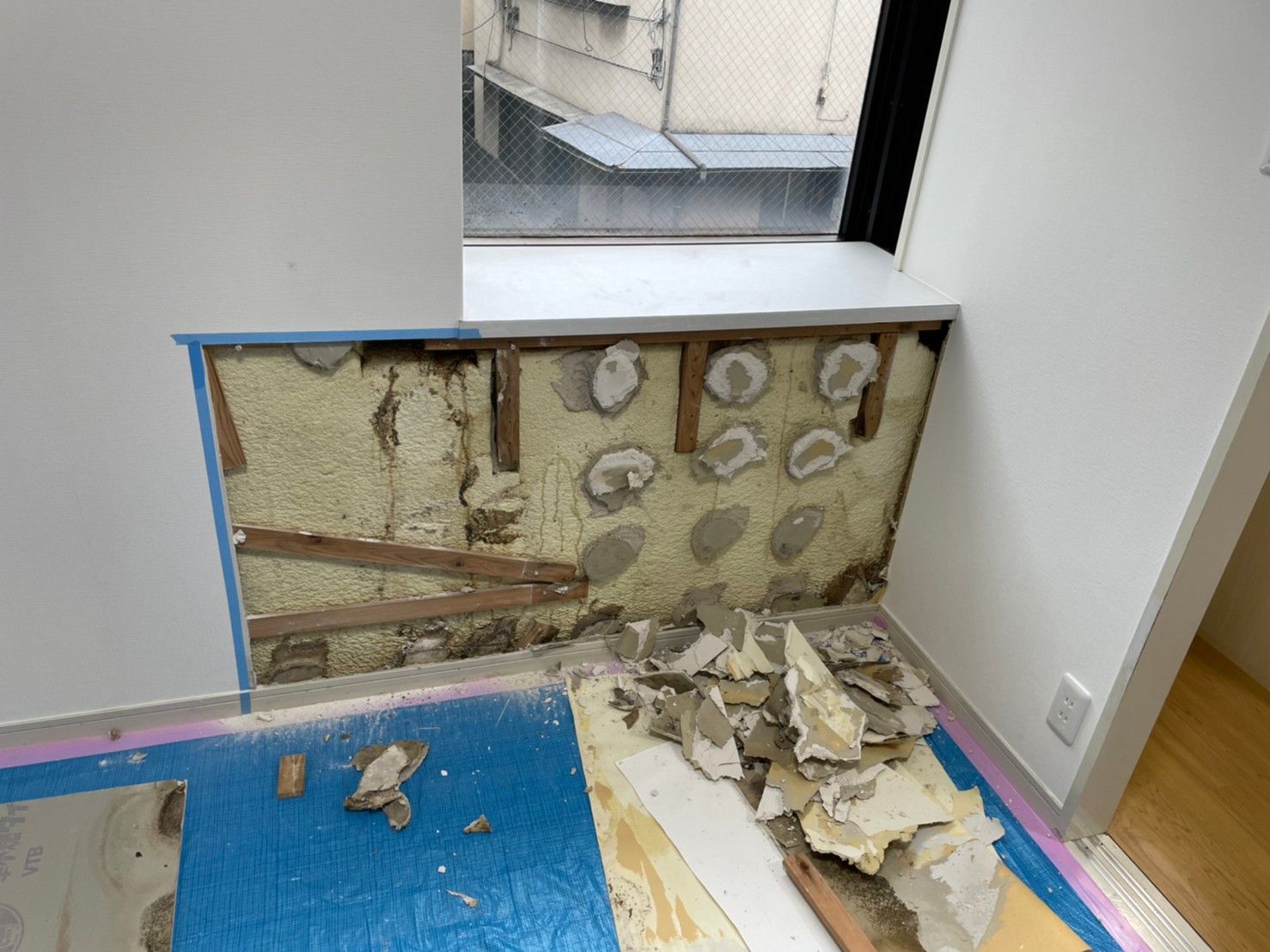 現状、分かっていることは、出窓下壁面に壁紙の膨れがあり、下部分には、うっすらと紫じみた後が見受けられることです。この部分の壁を解体し、どの部分から漏水しているかの原因を探っていきます。