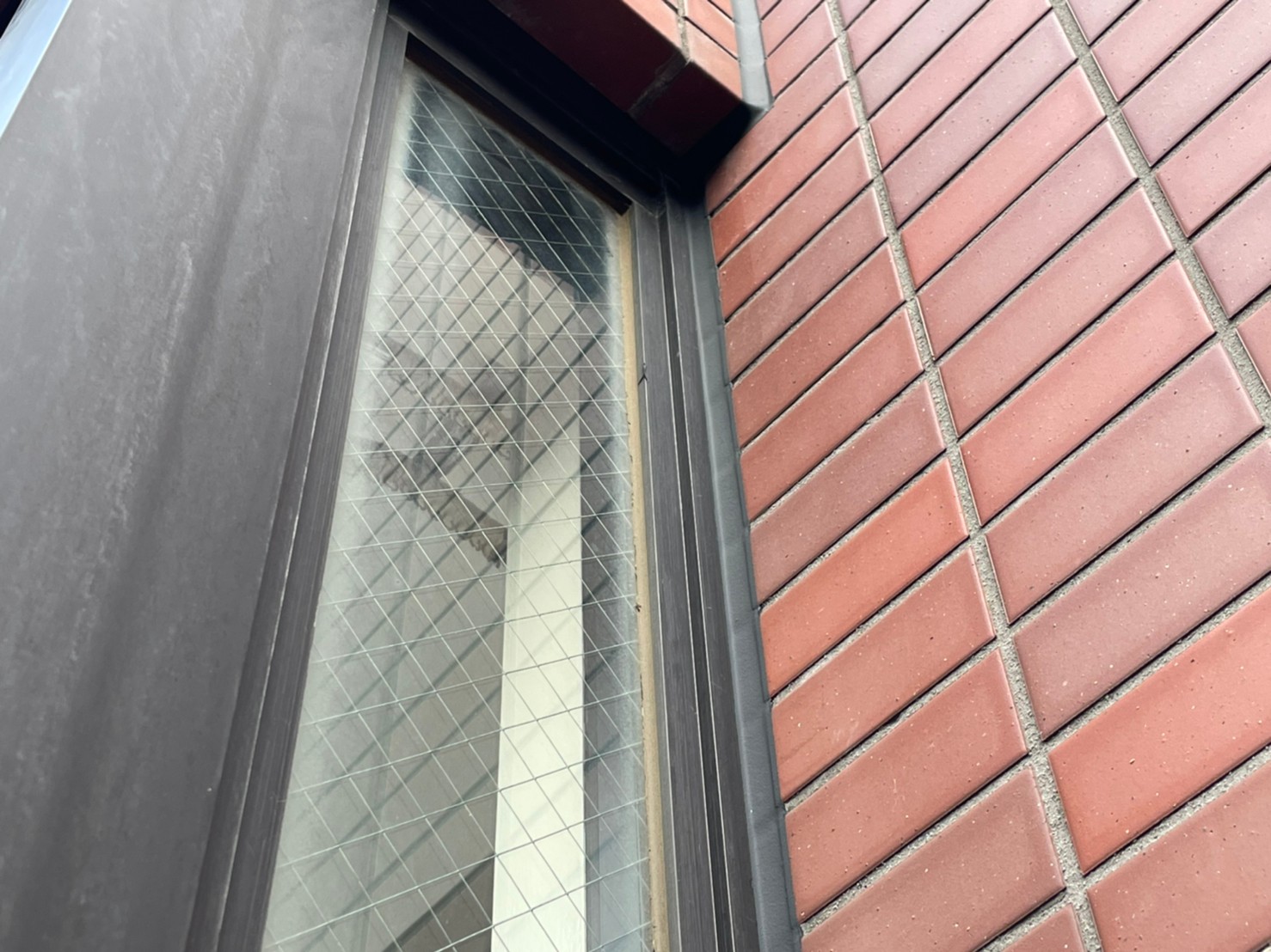 確認したところ、サッシ上、出窓廻り外壁タイル等に疑いのある個所は見受けられませんでしたが、サッシ廻りのシーリングに重点を置いて確認したところ、外壁とサッシの取り合い部分にわずかな隙間を発見しました。※上記写真4・5・6・7・8に経年によるシールの瘦せと剥がれが見受けられます。