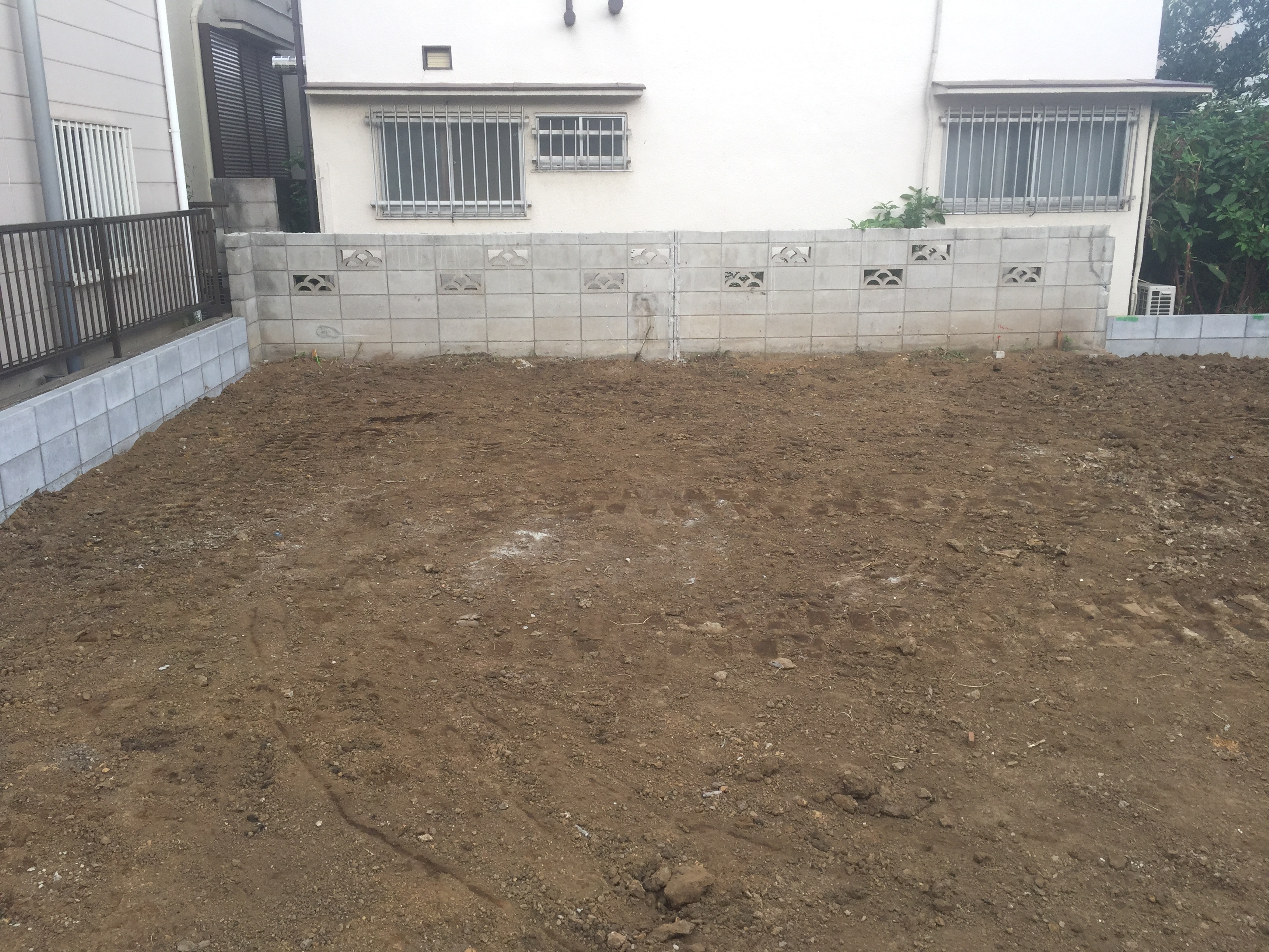 無事既存建物の解体と、地盤改良が終わった写真になります。この段階で、やっと建物自体の工事に入ることができるようになり、ここから遣り方(やりかた)をして基礎工事が始まります。