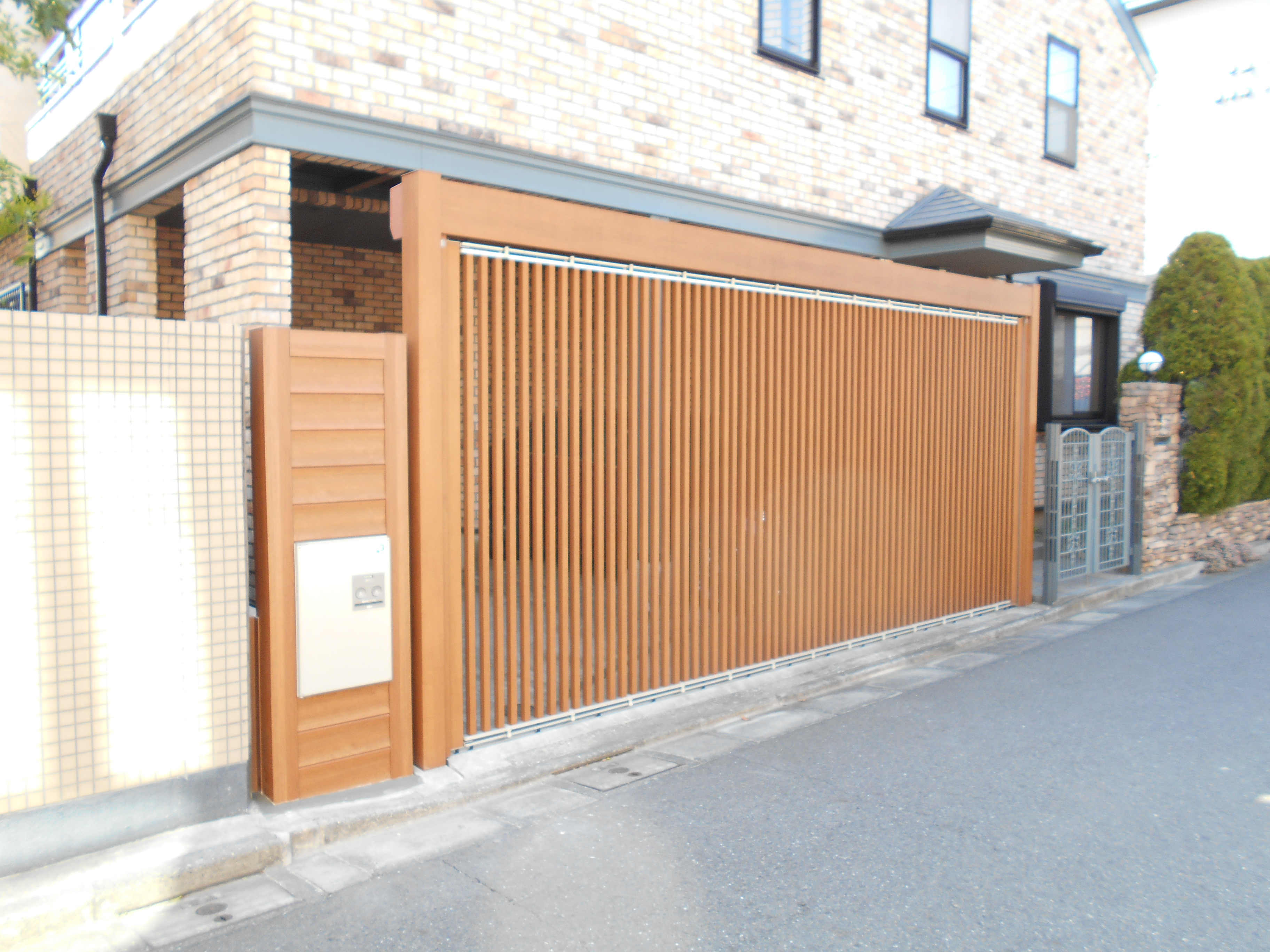 工事の内容:既存塀(ブロック造にタイル張り)撤去後、宅配ボックス設置。支えるフレームは