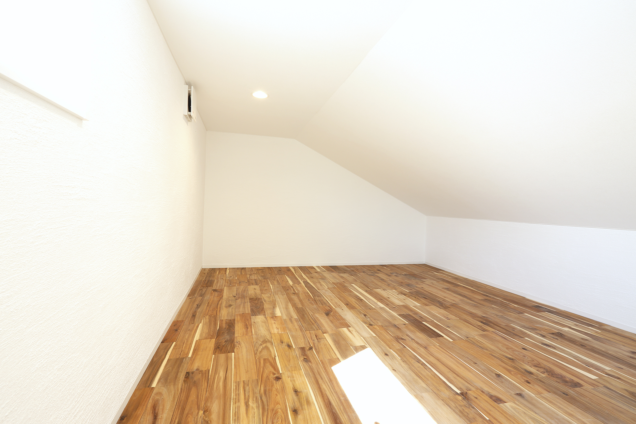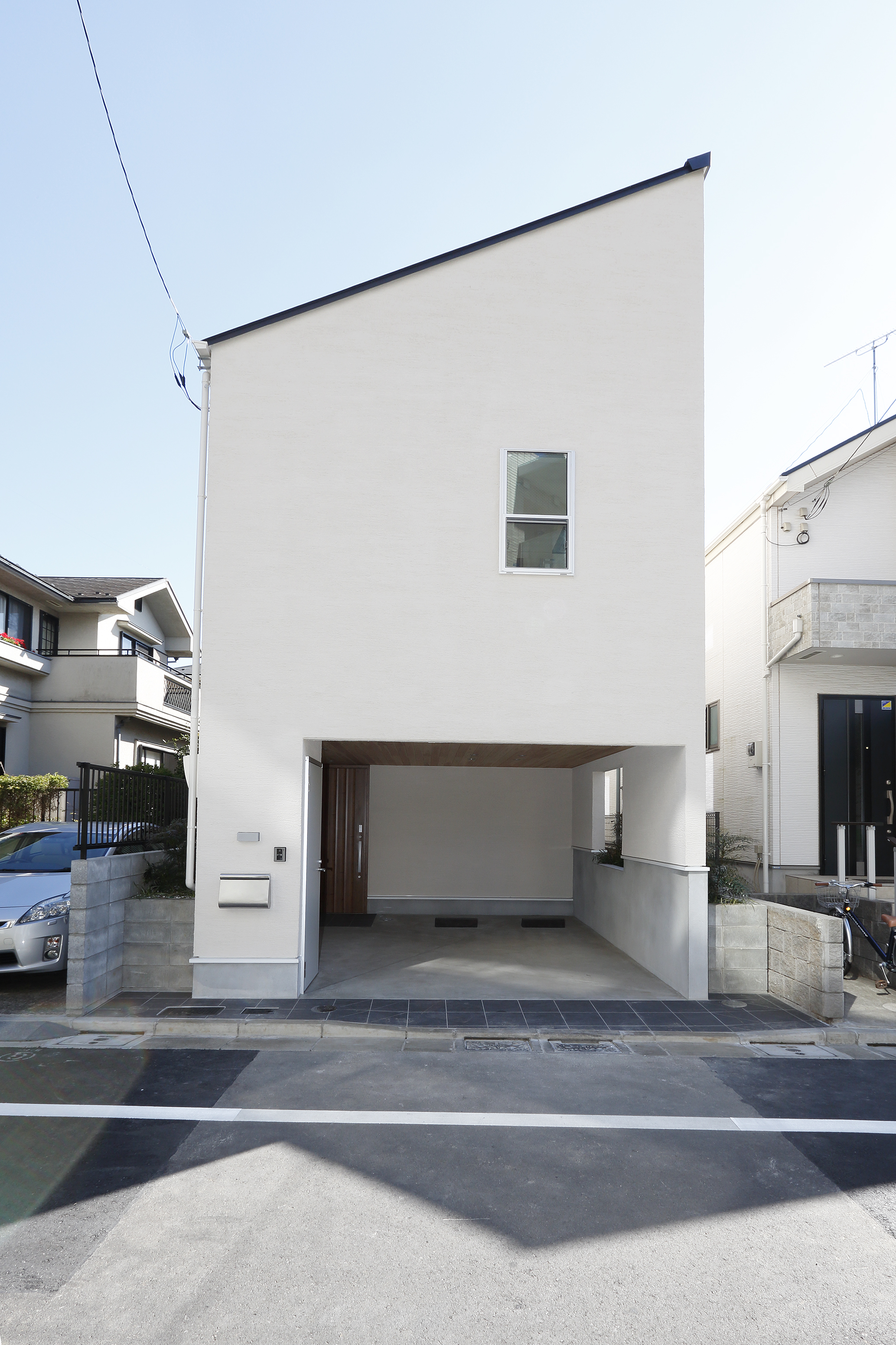 敷地の形状が間口より奥行きの長い細長い敷地の形状を逆手に取り、あえて西側開口部を極力小さく最小限に留め、外部から見ると閉鎖されたイメージを表現、しかし、駐車場の天井に杉板を貼る事によって冷たいイメージにならないようにしました。そして、玄関ドアを開けて内部に入ると太陽光が眩しく、中庭を中心に各部屋が隅々まで白く光っているとき、一気に心が開放された感覚になります。