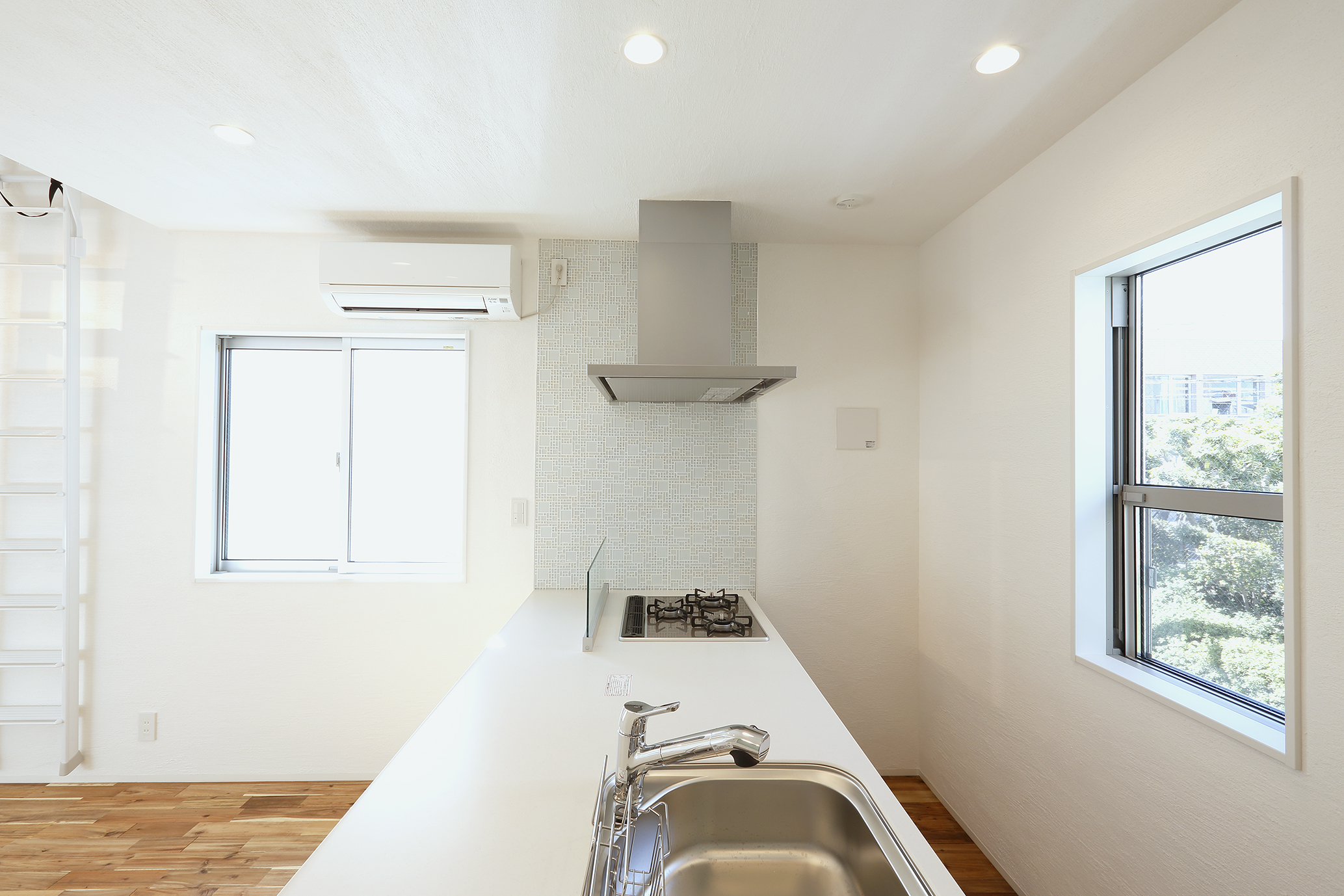 いわゆる、うなぎの寝床的な細長い敷地条件で、奥の室内の採光が採りにくいという欠点を補う為、建物の中心に中庭を配すことにより直接1階の室内に日差しが入るように致しました。又、外壁を白い漆喰にすることで、光が乱反射し建物内部の隅々まで光が届き、さらに、玄関・廊下・リビングダイニングの壁も漆喰で仕上ることにより、中庭を内部空間に取り込むことが出来ました。この結果、27坪の居住スペースがあたかも30坪以上の機能を体感できると同時に、明るい室内とプライバシーを確保した建物となりました。