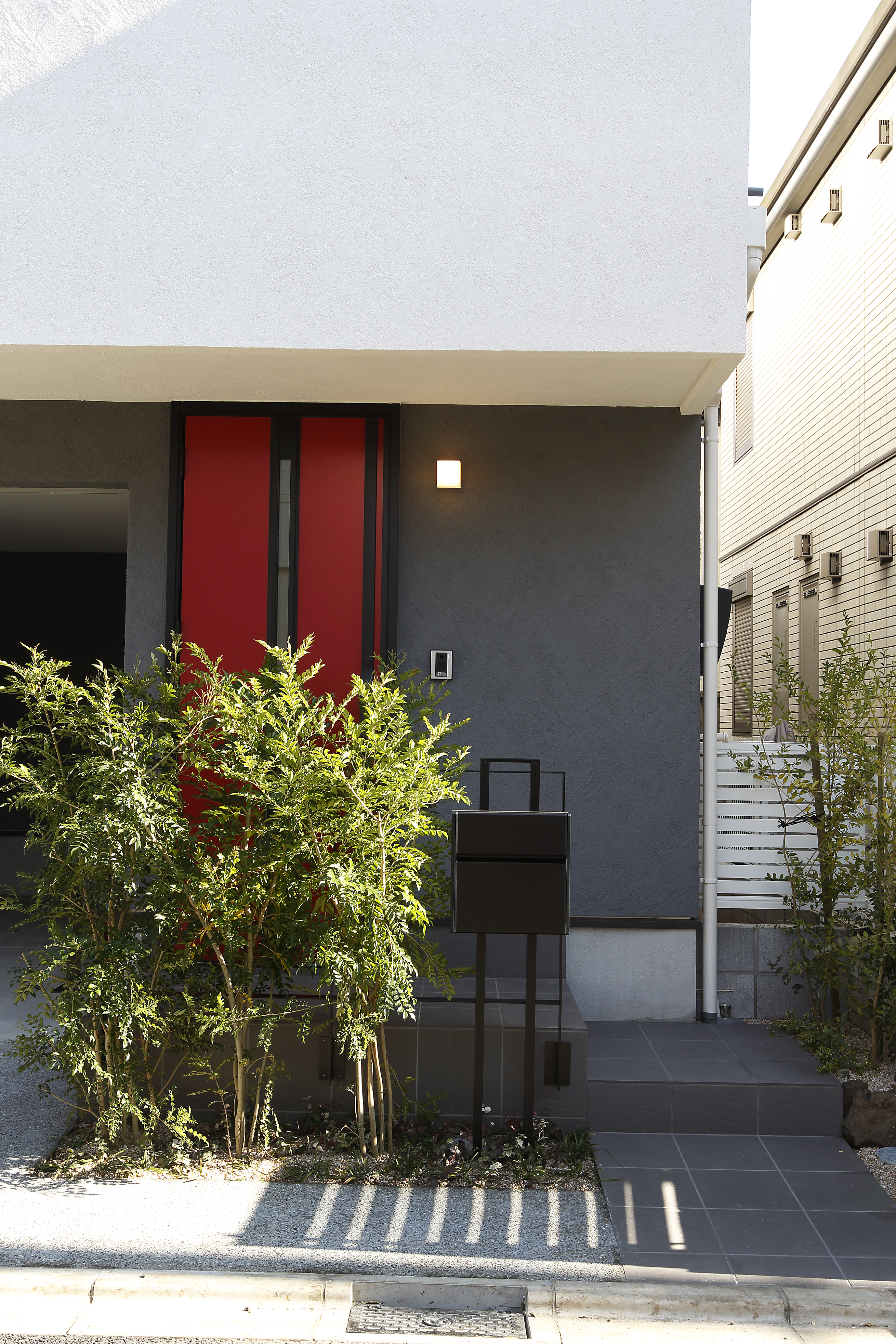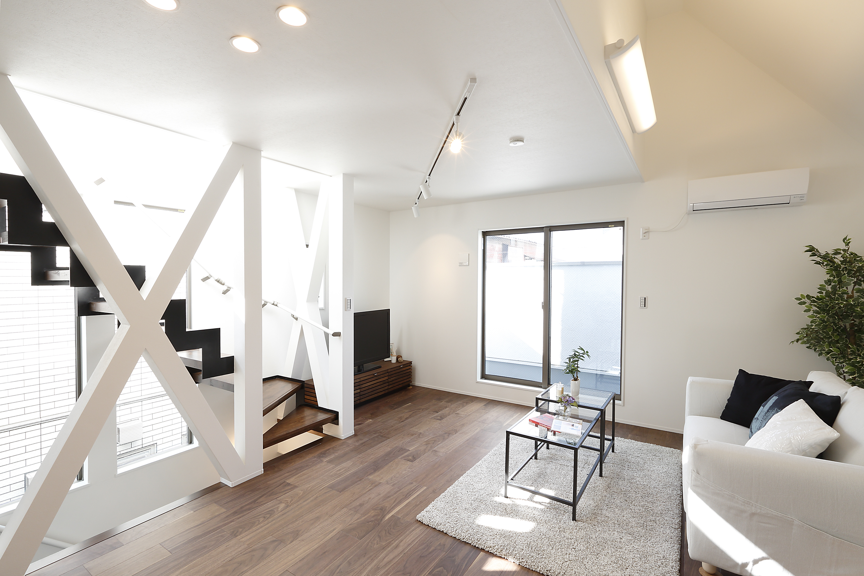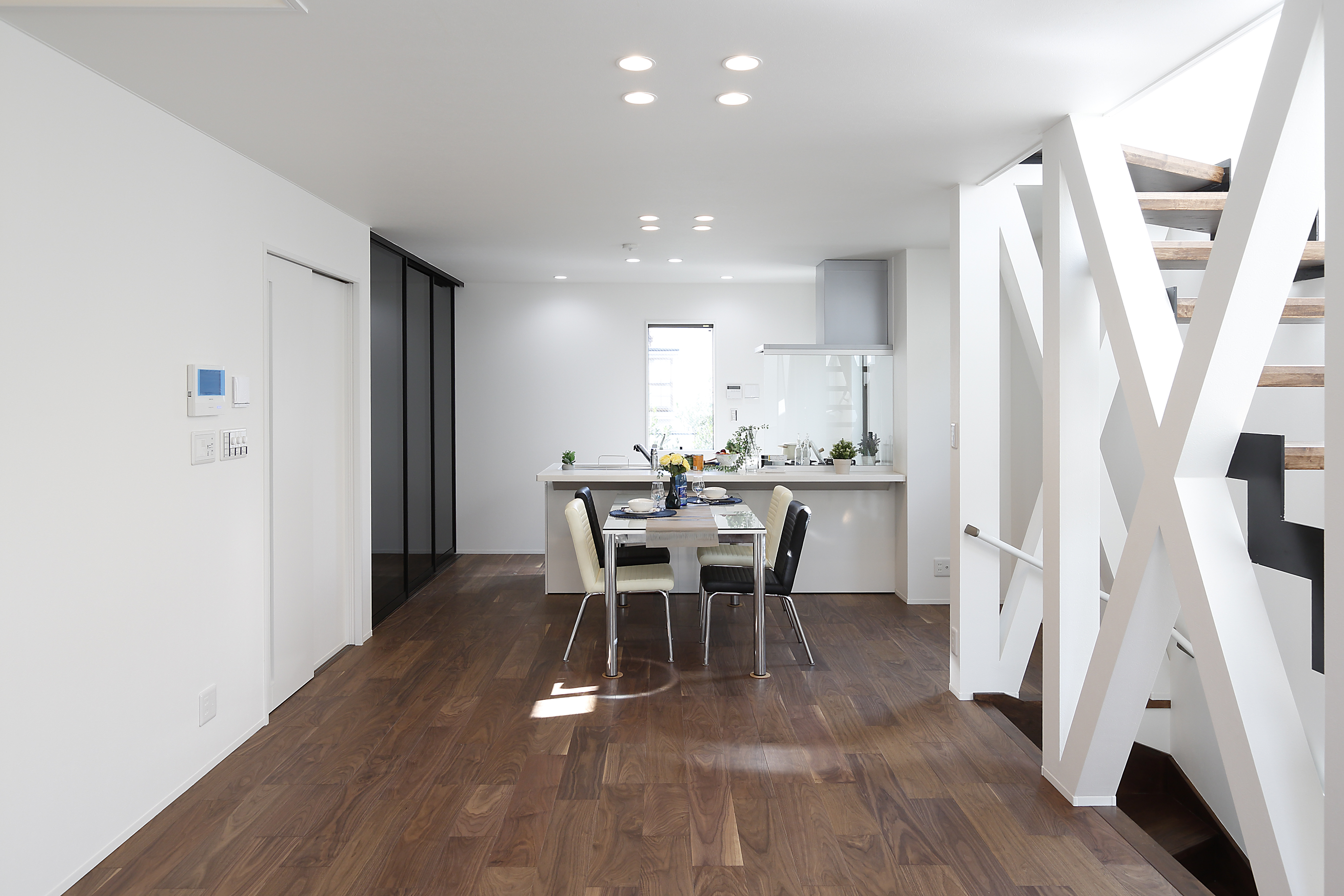 狭小地であるがゆえ、採光を取ることに工夫が必要な立地条件ですが、階段室を開放し階段をストリップ階段にすることでリビングダイニングキッチン全体に日差しがいっぱいに入ります。しかし、開口部を外部からの視線から逸らしているので、プライバシーは確保され独立した空間を演出しています。